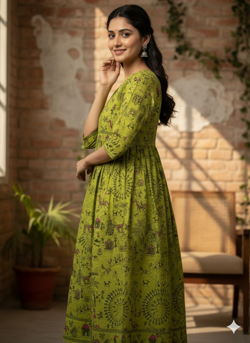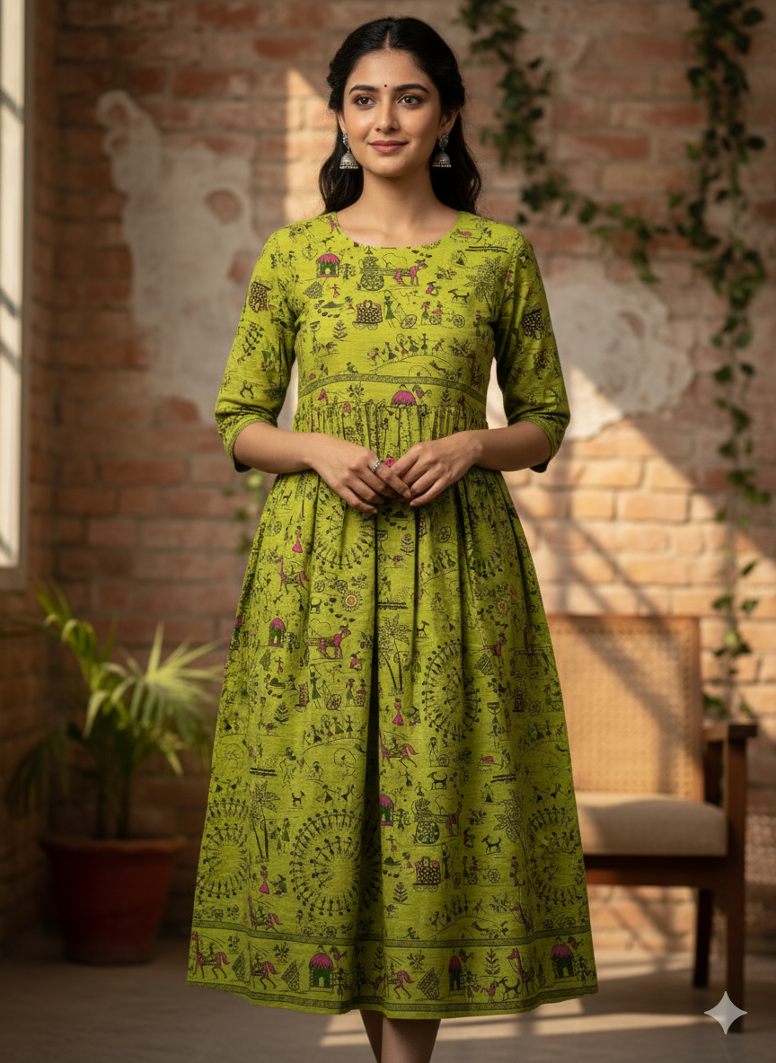Banana Green Floral Printed Cotton Frock for Women – Casual Wear | Bhavana Handlooms