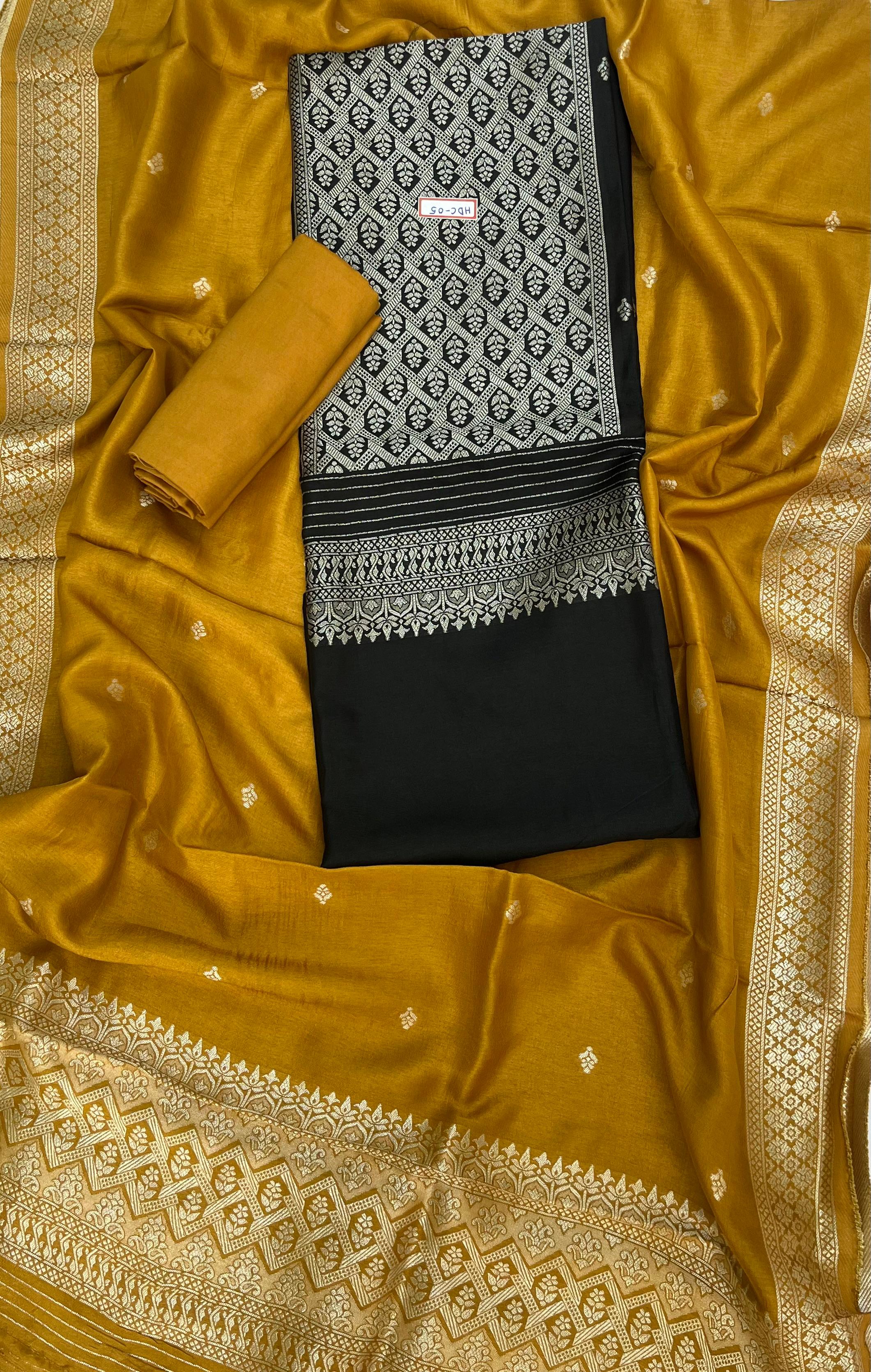 This set includes 1 top, 1 bottom, and 1 dupatta in rich Chanderi silk fabric.