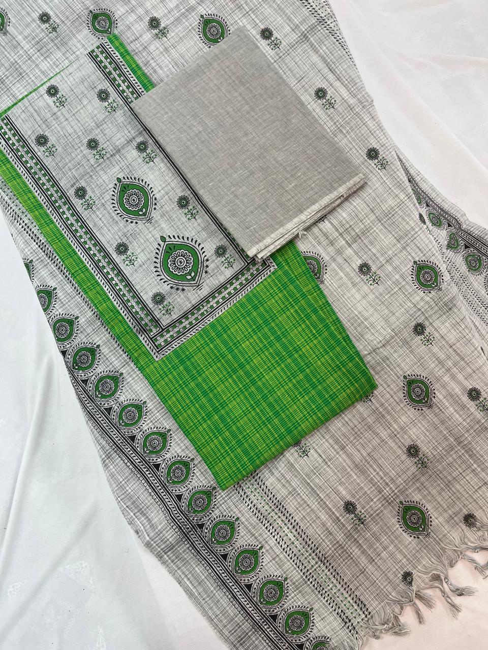 Keywords: Cotton Dress Material, Pure Cotton Fabric Set, Bhavana Handlooms, 3-Piece Cotton Material, Handloom Cotton Dupatta, Comfortable Cotton Outfit.