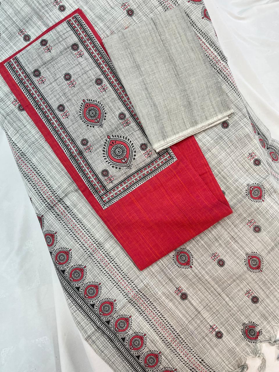 Keywords: Cotton Dress Material, Pure Cotton Fabric Set, Bhavana Handlooms, 3-Piece Cotton Material, Handloom Cotton Dupatta, Comfortable Cotton Outfit.
