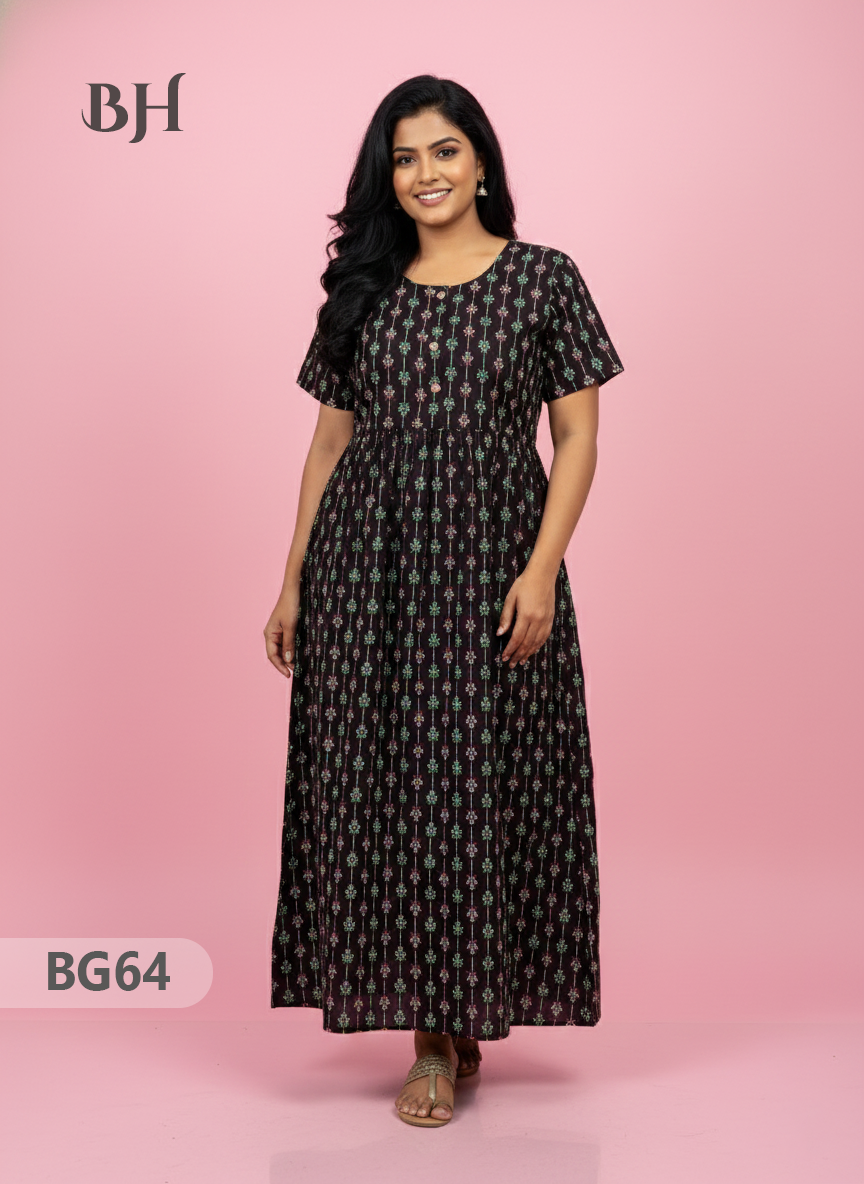100% Cotton (Soft) Free Size → up to Bust 44" (2XL) Height (Dress Length): 53" Easy Care • Machine Washable