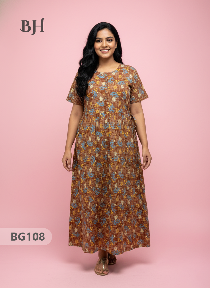 100% Cotton (Soft) Free Size → up to Bust 44" (2XL) Height (Dress Length): 53" Easy Care • Machine Washable