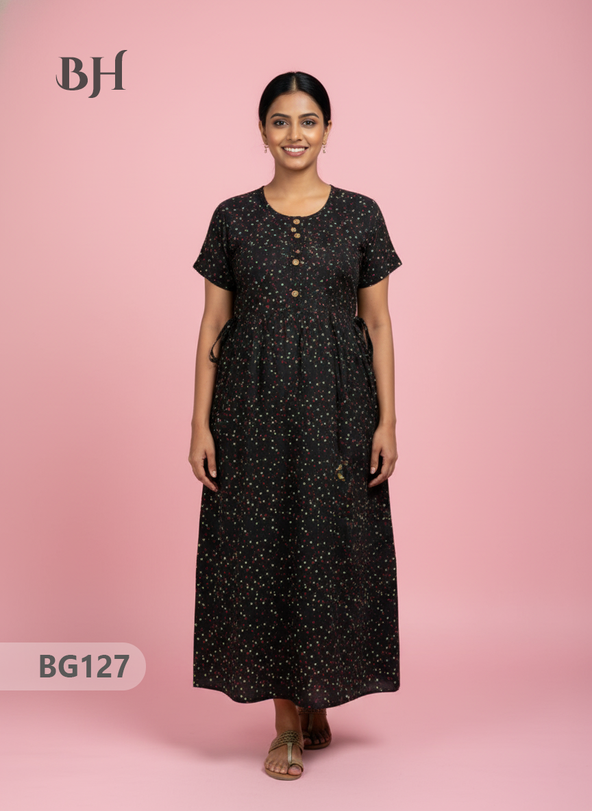 100% Cotton (Soft) Free Size → up to Bust 44" (2XL) Height (Dress Length): 53" Easy Care • Machine Washable