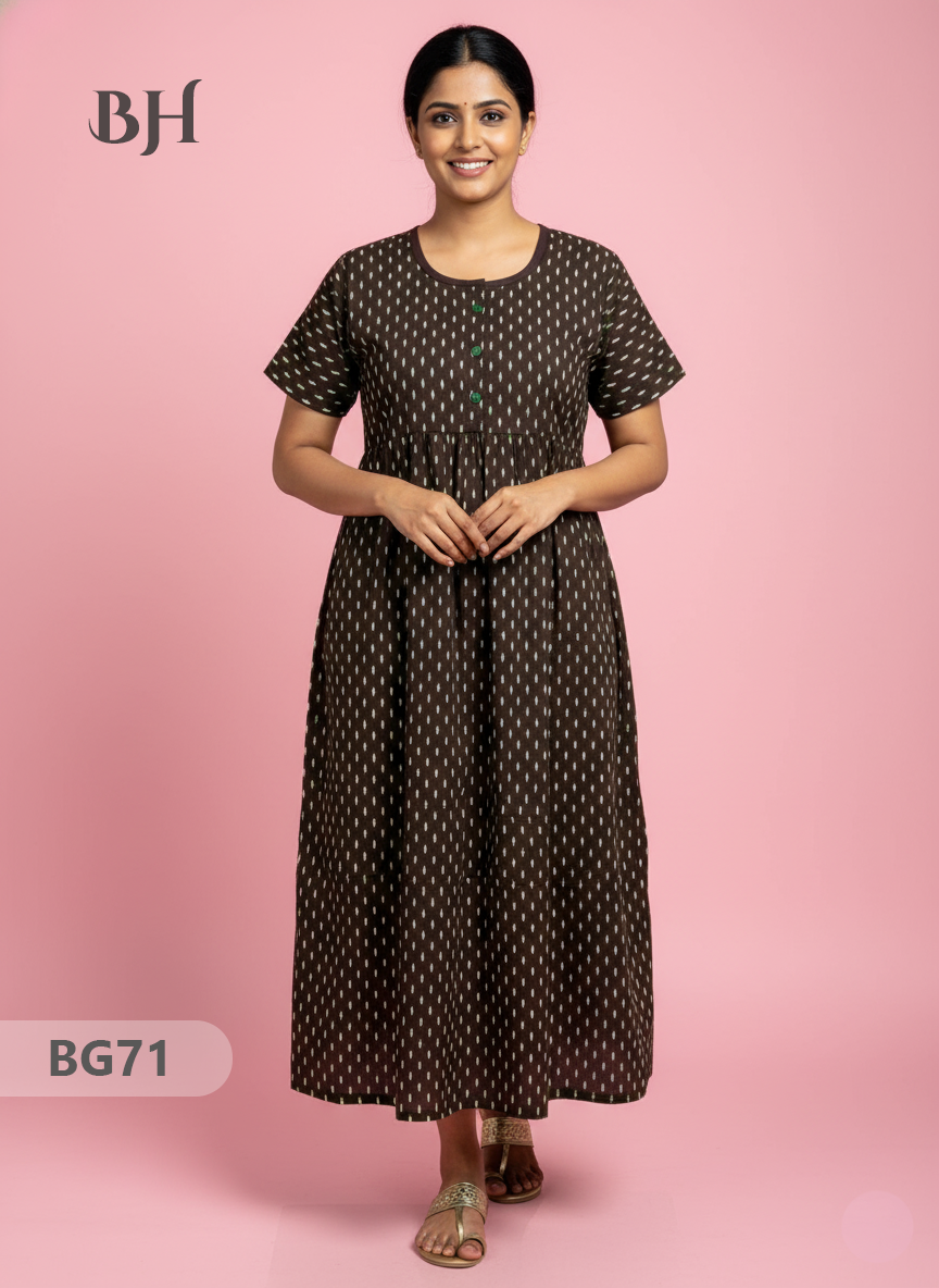 100% Cotton (Soft) Free Size → up to Bust 44" (2XL) Height (Dress Length): 53" Easy Care • Machine Washable