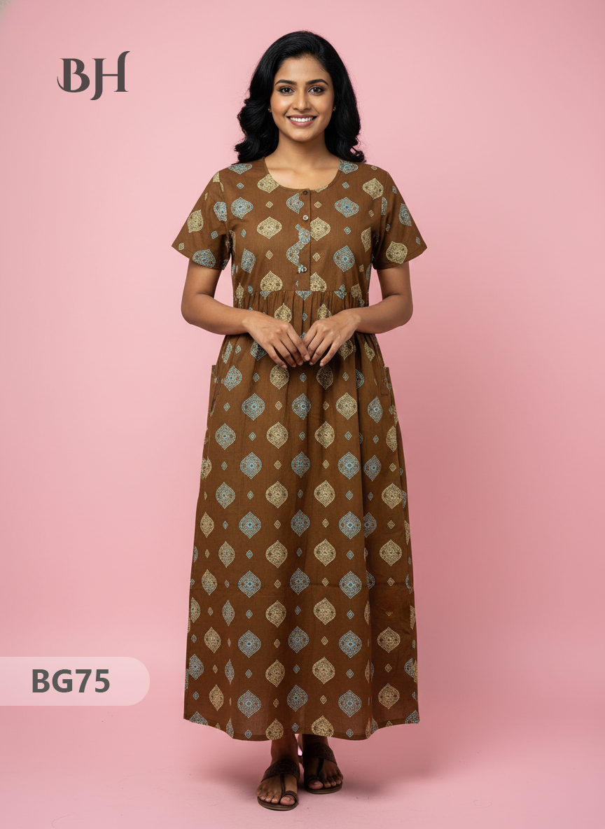Wear as comfy nightwear or a relaxed at-home frock. Pair with lightweight slippers for cosy evenings or layer with a shrug for early-morning chores. The side pocket adds convenience for small essentials.