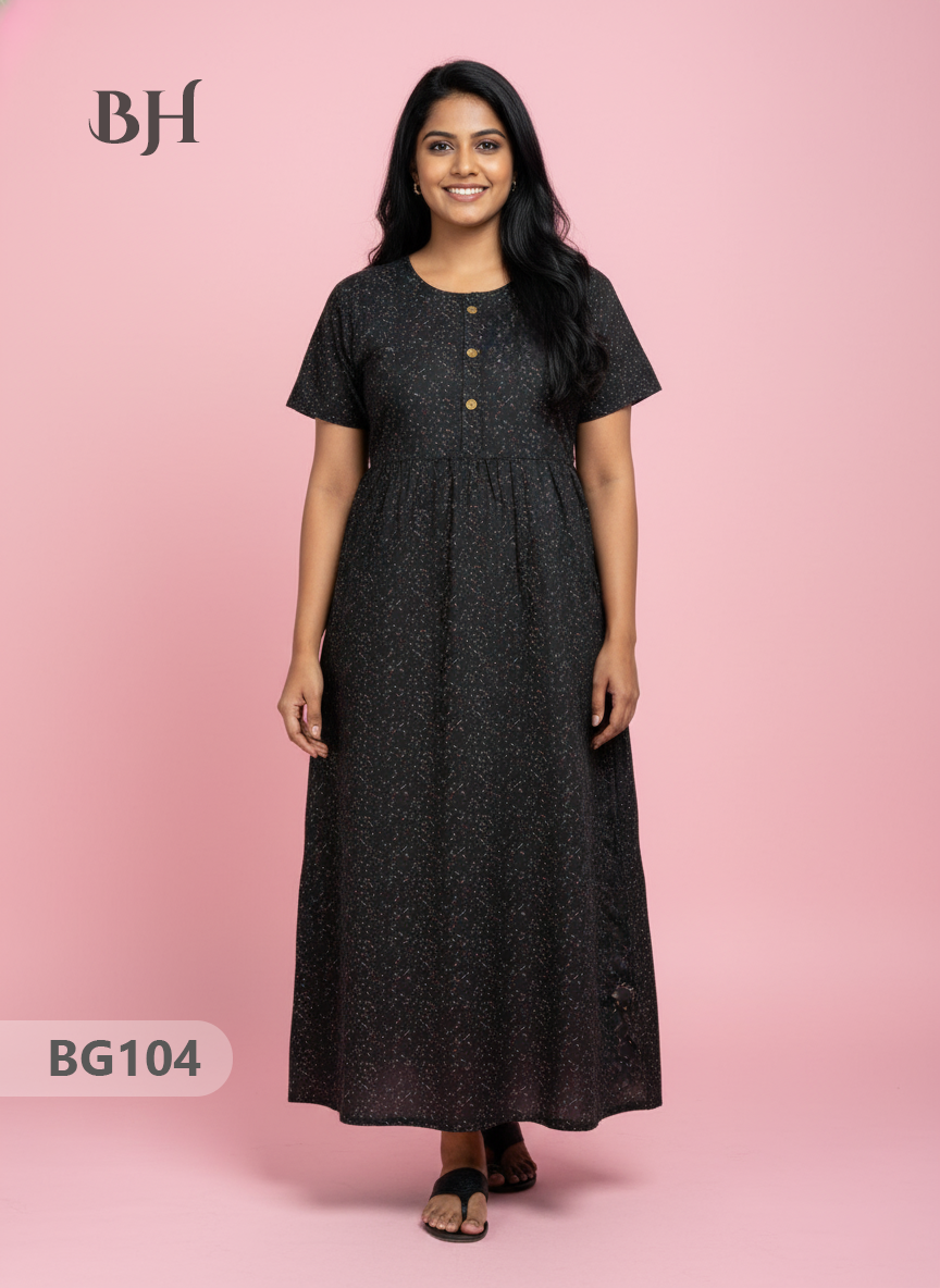 100% Cotton (Soft) Free Size → up to Bust 44" (2XL) Height (Dress Length): 53" Easy Care • Machine Washable