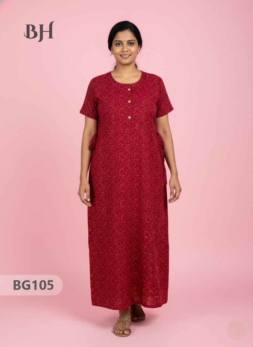 Soft, breathable cotton nighty designed for relaxed comfort at home. Smart knot detail at the neckline, handy side pocket, and an easy free-fit silhouette — perfect for lounging and sleep.