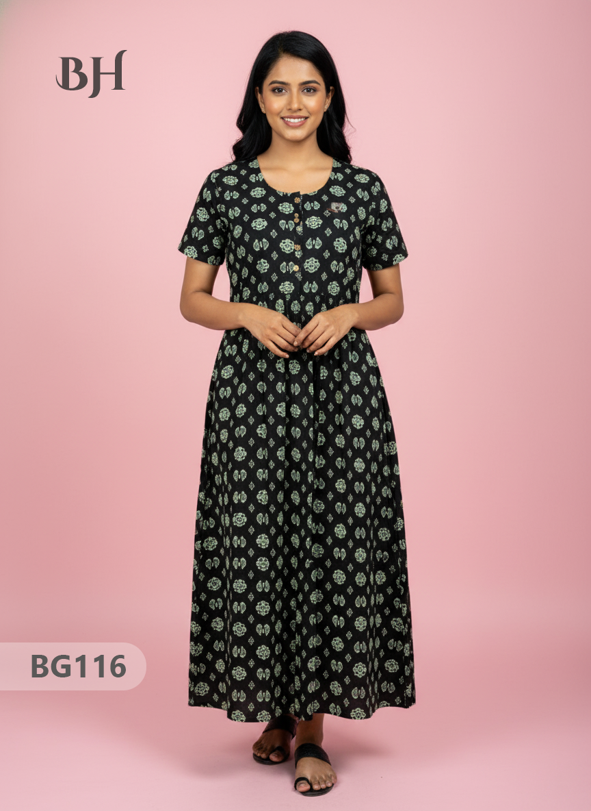 100% Cotton (Soft) Free Size → up to Bust 44" (2XL) Height (Dress Length): 53" Easy Care • Machine Washable
