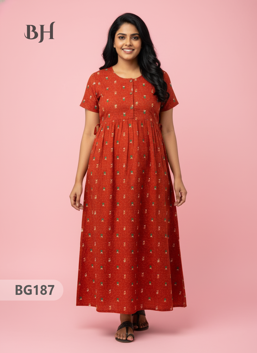 100% Cotton (Soft) Free Size → up to Bust 44" (2XL) Height (Dress Length): 53" Easy Care • Machine Washable