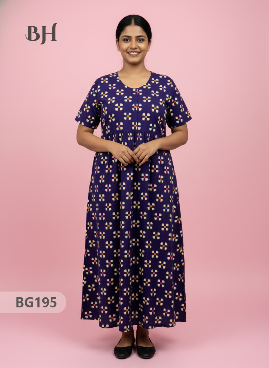 100% Cotton (Soft) Free Size → up to Bust 44" (2XL) Height (Dress Length): 53" Easy Care • Machine Washable