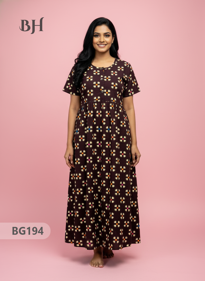 Wear as comfy nightwear or a relaxed at-home frock. Pair with lightweight slippers for cosy evenings or layer with a shrug for early-morning chores. The side pocket adds convenience for small essentials.