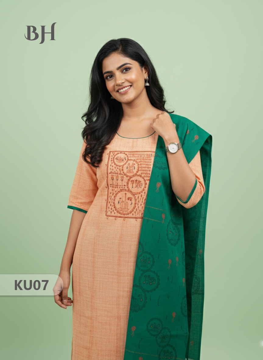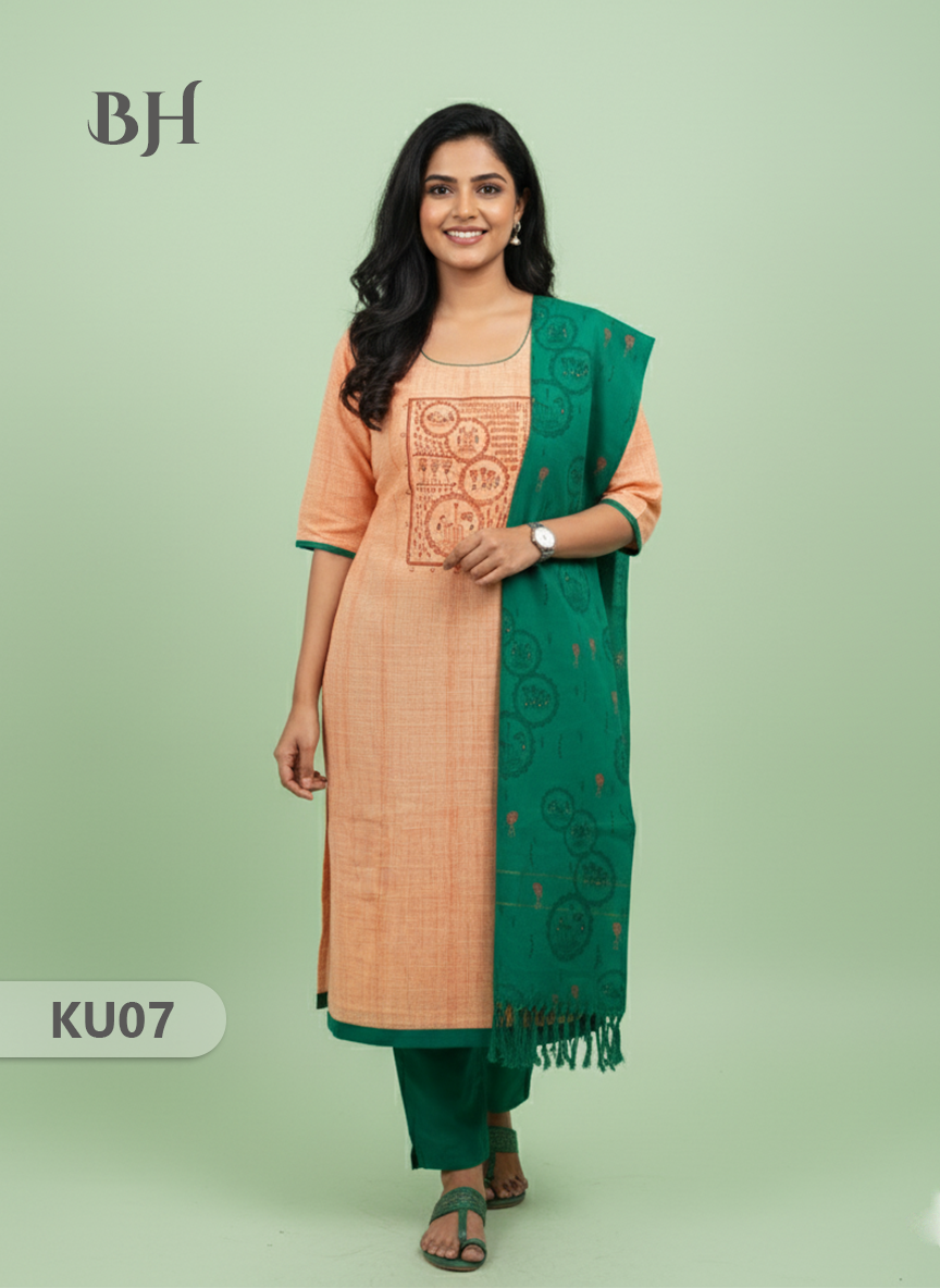Keywords: Premium Cotton Kurti Set, 3 Piece Ethnic Set, Straight Cut Kurti with Dupatta, Bhavana Originals, Cotton Kurti with Full-Length Lining.