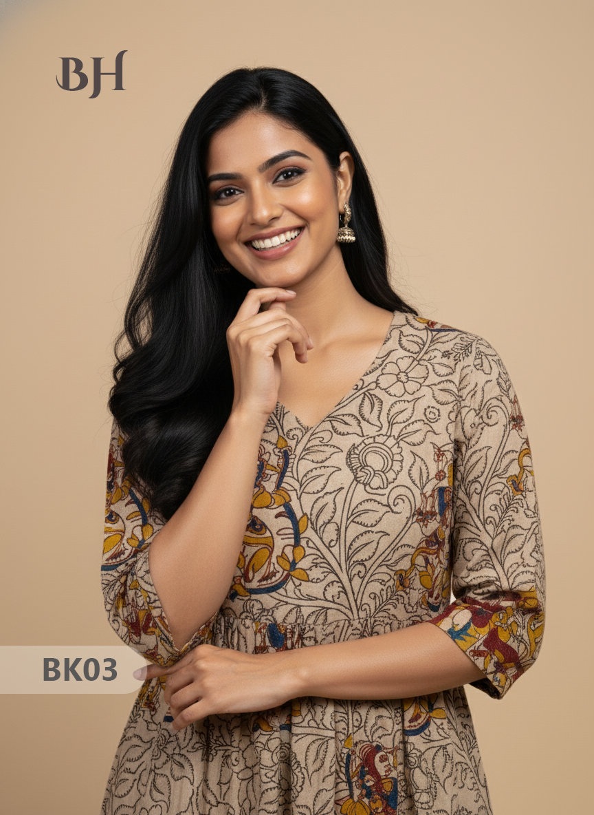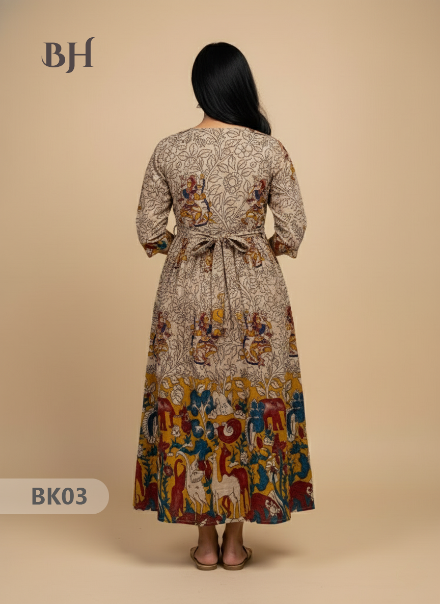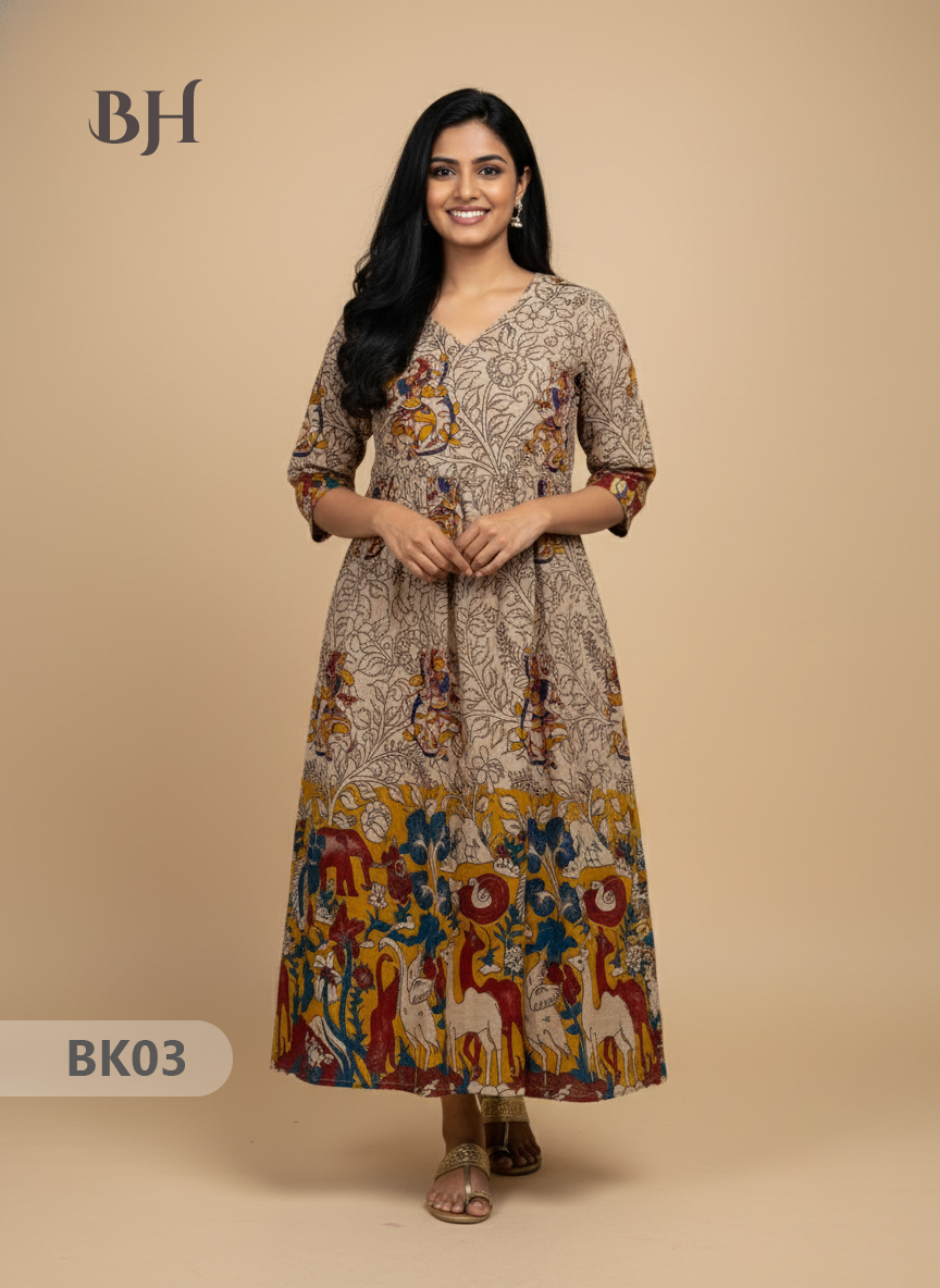 Designer Kalamkari Frock Half White & Yellow Colour – One Side Border Premium Cotton Fabric
