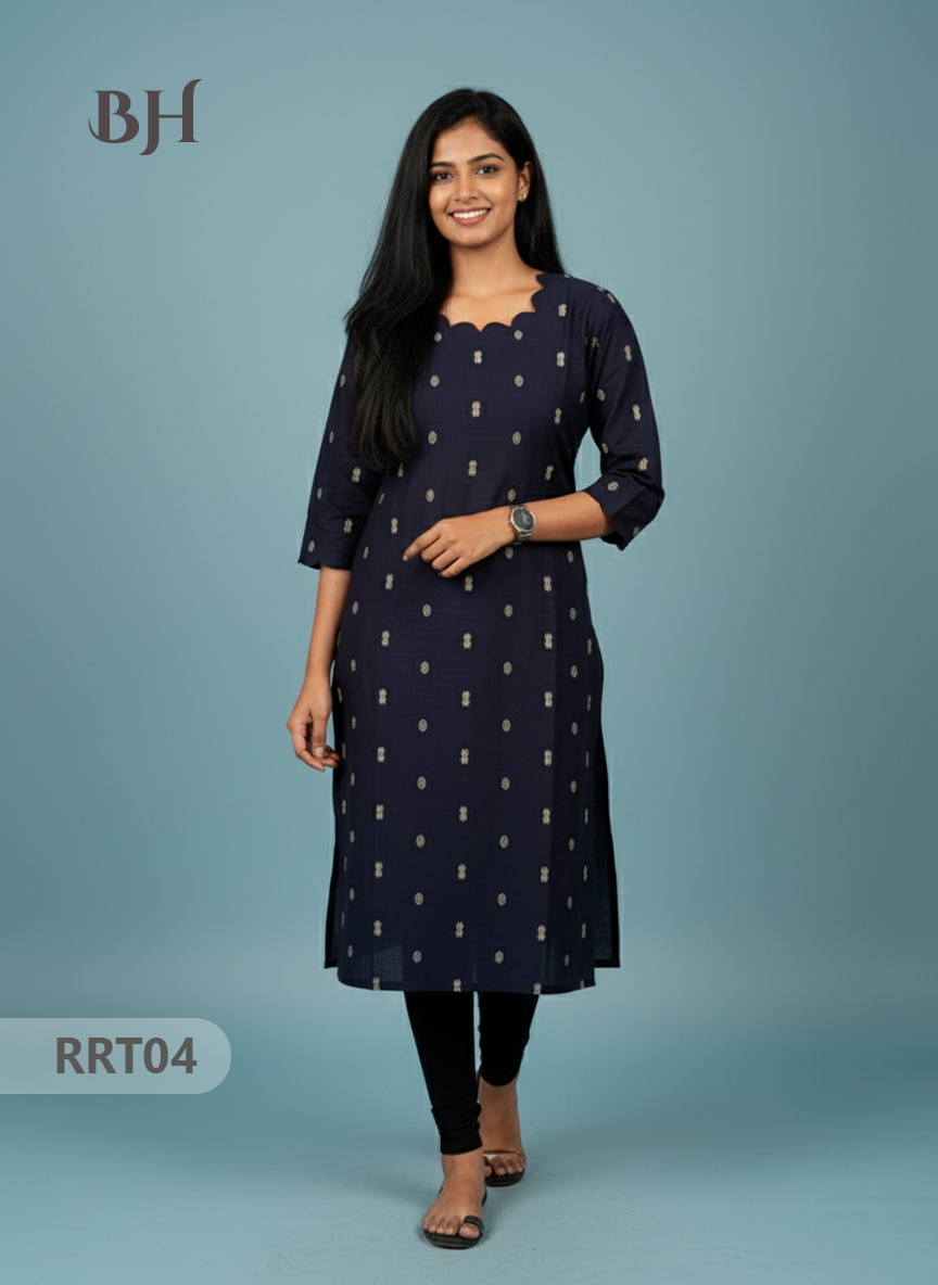 Designer Raw Silk Straight Cut Top in Navy Blue | Cut Work Neck | Full-Length Lining