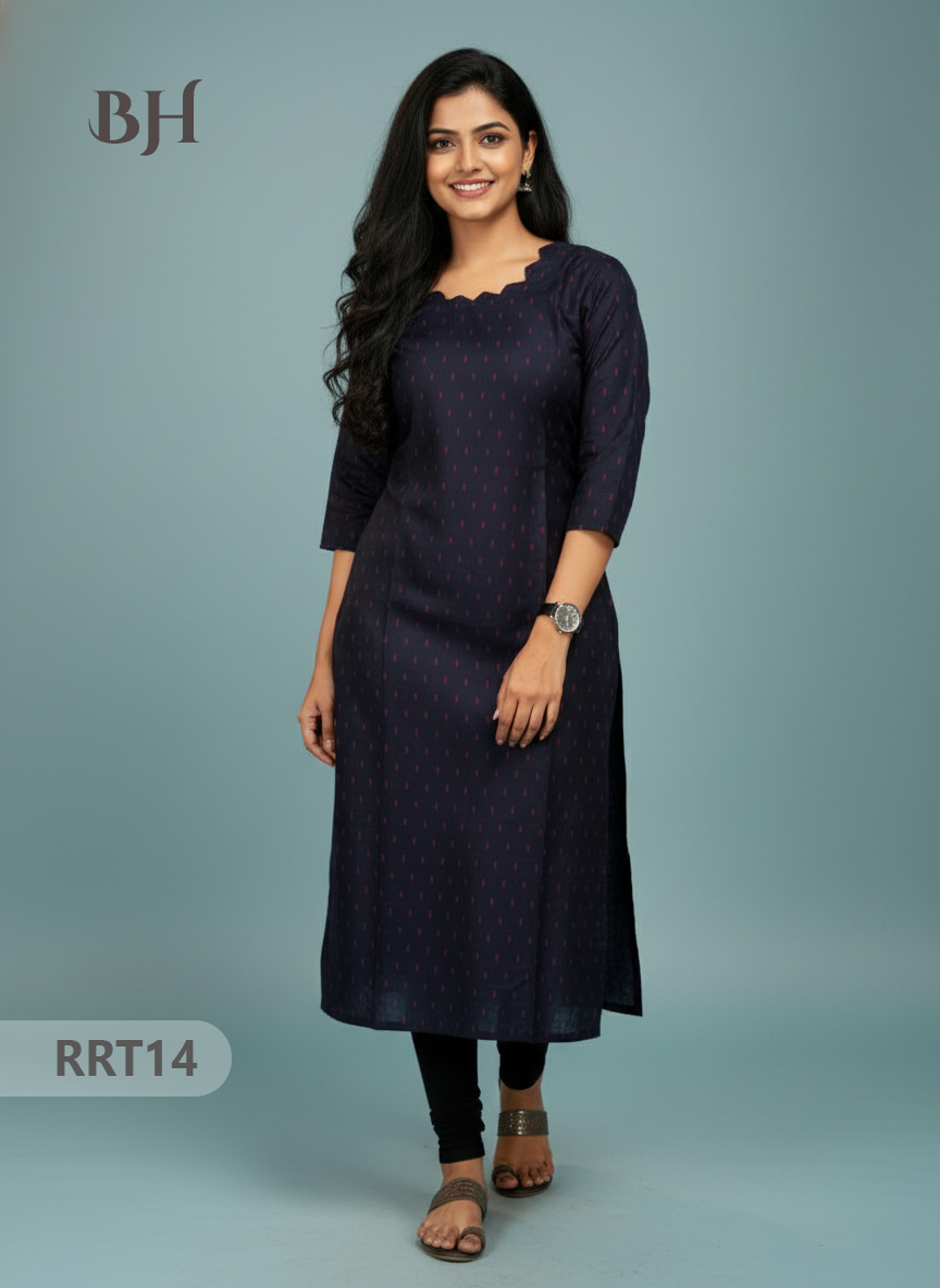 Designer Raw Silk Straight Cut Top in Navy Blue | Cut Work Neck | Full-Length Lining