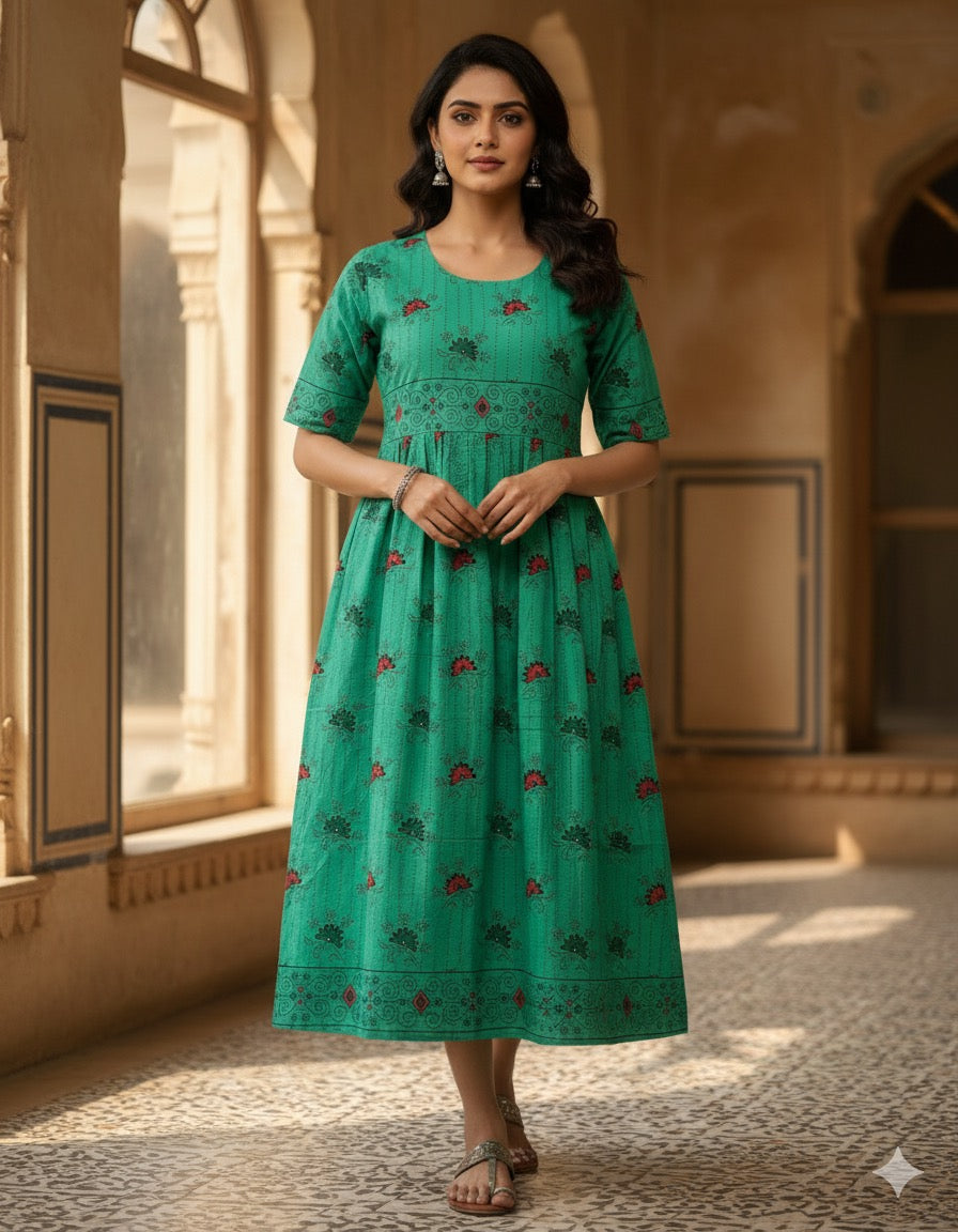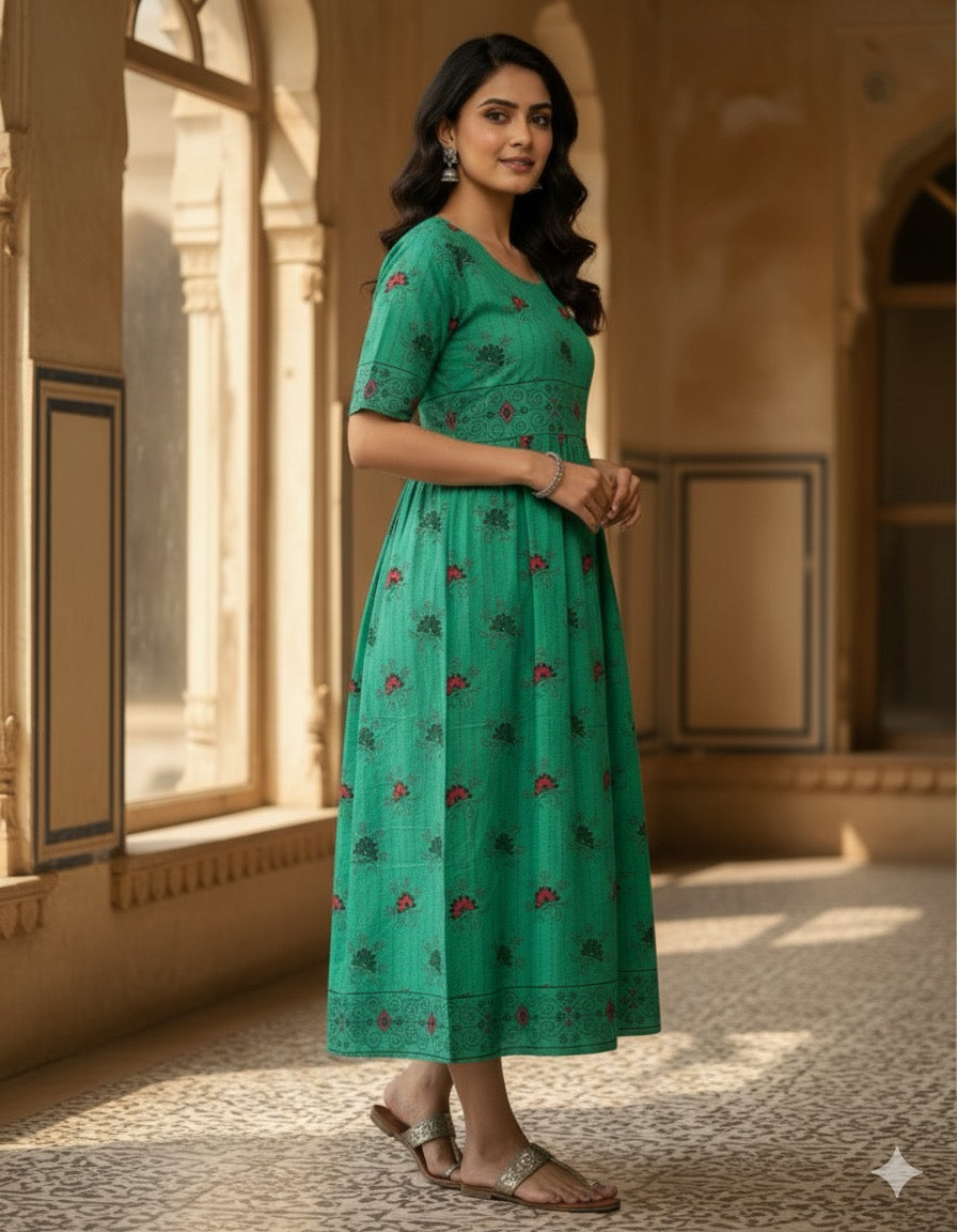 Floral Printed Cotton Frock for Women – Emrold Green Dress | Bhavana Handlooms