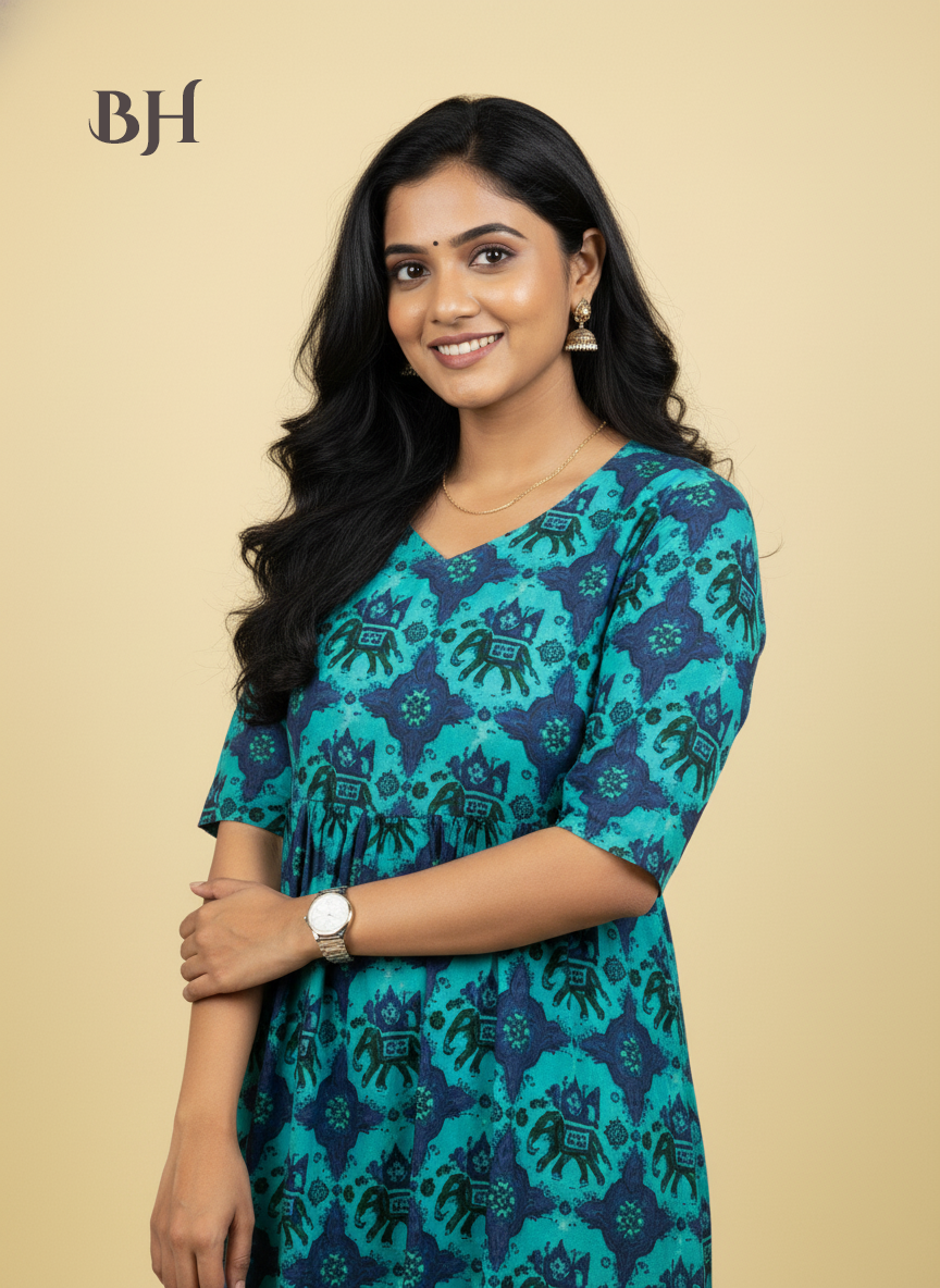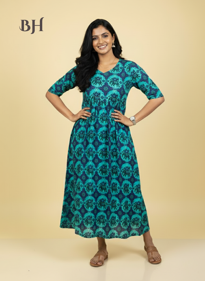 Green Blue Cotton Frock for Women | Comfortable Daily Wear Dress