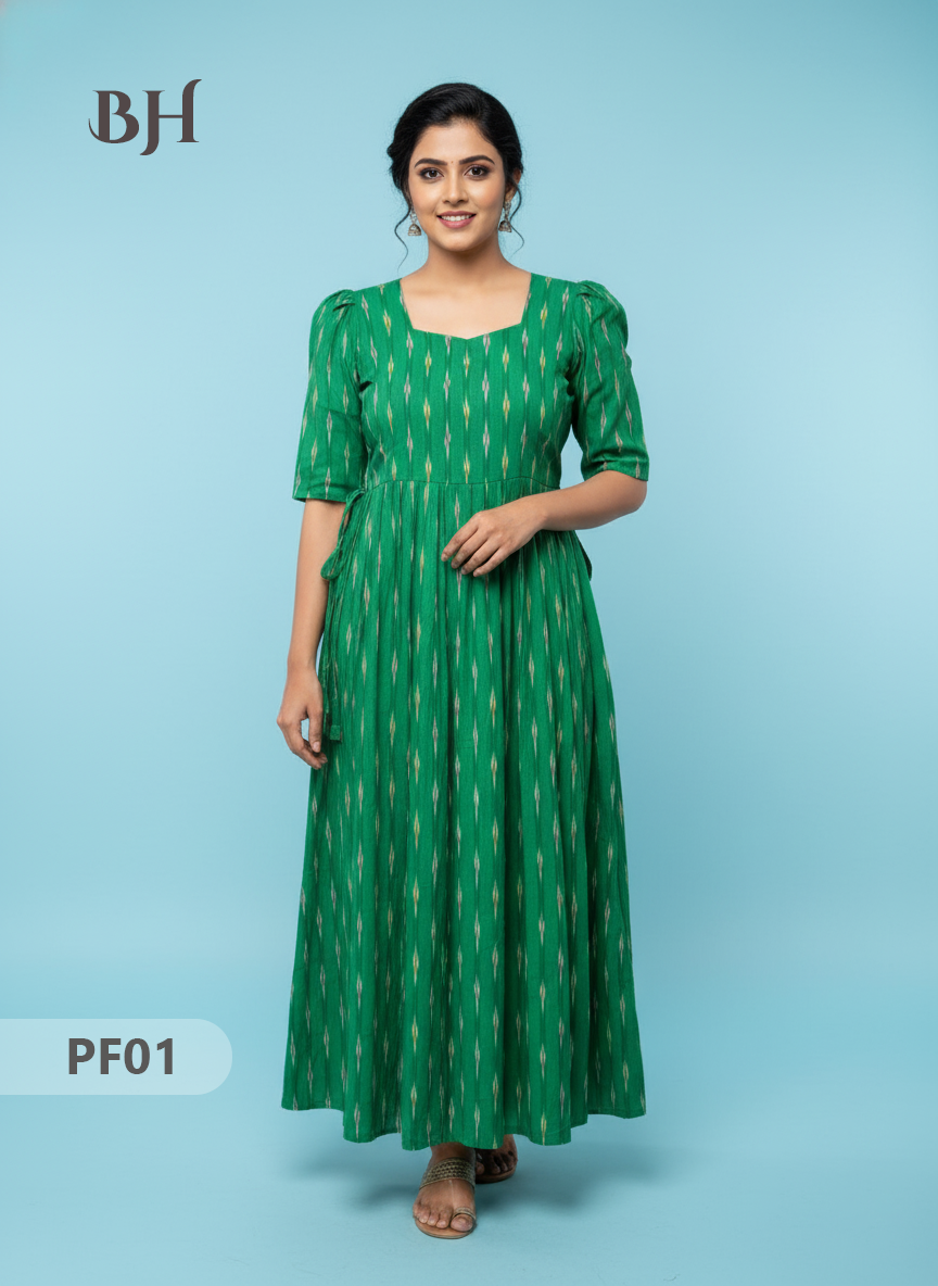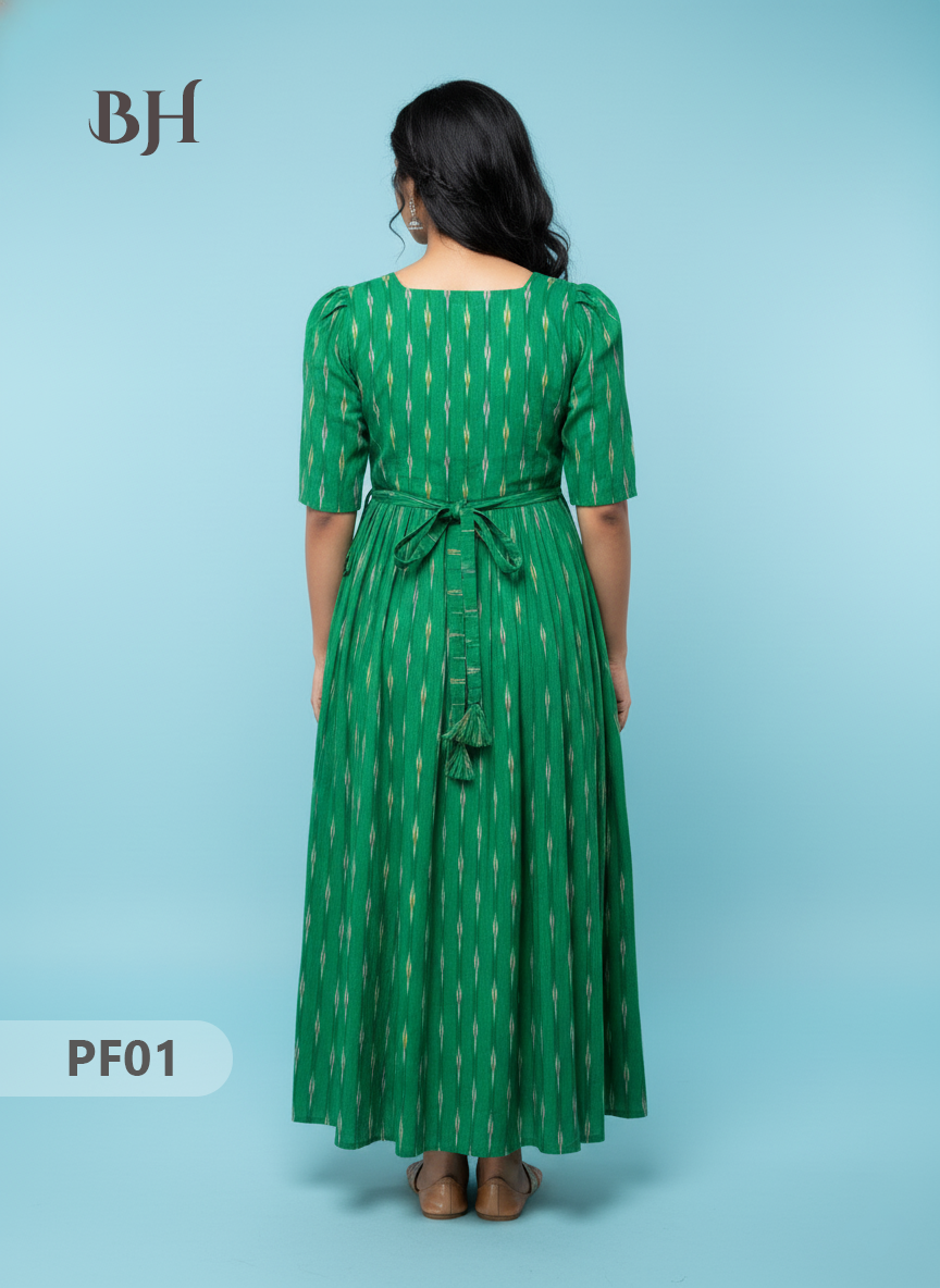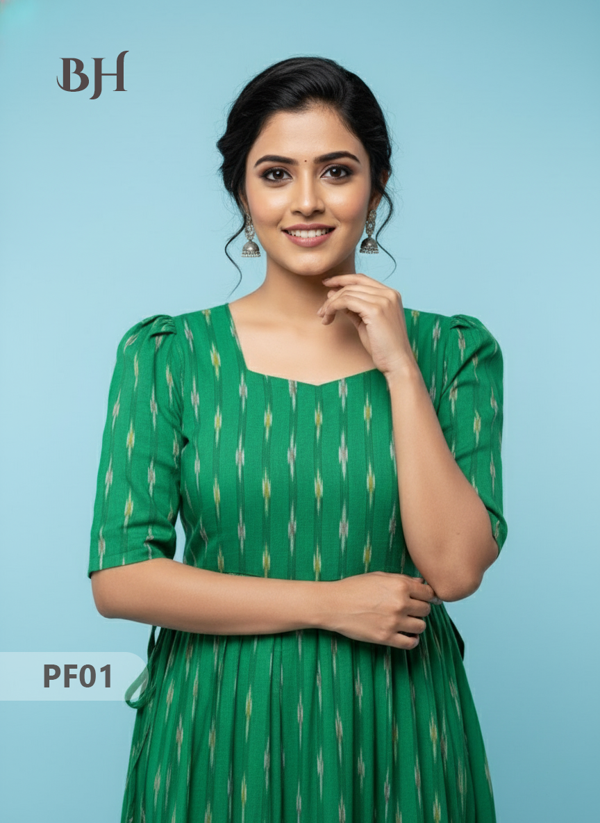 Handcrafted Pochampally Green Cotton Frock with Knot Detailing – Ethnic Wear for Women
