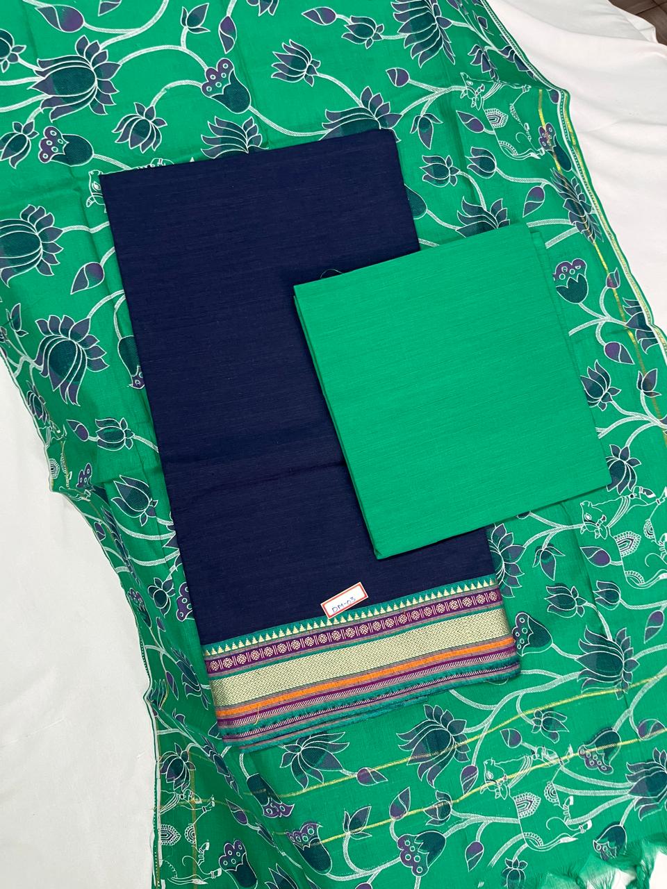Handloom Cotton Dress Material – Lux Green & Dark Blue Color | Bhavana Handlooms