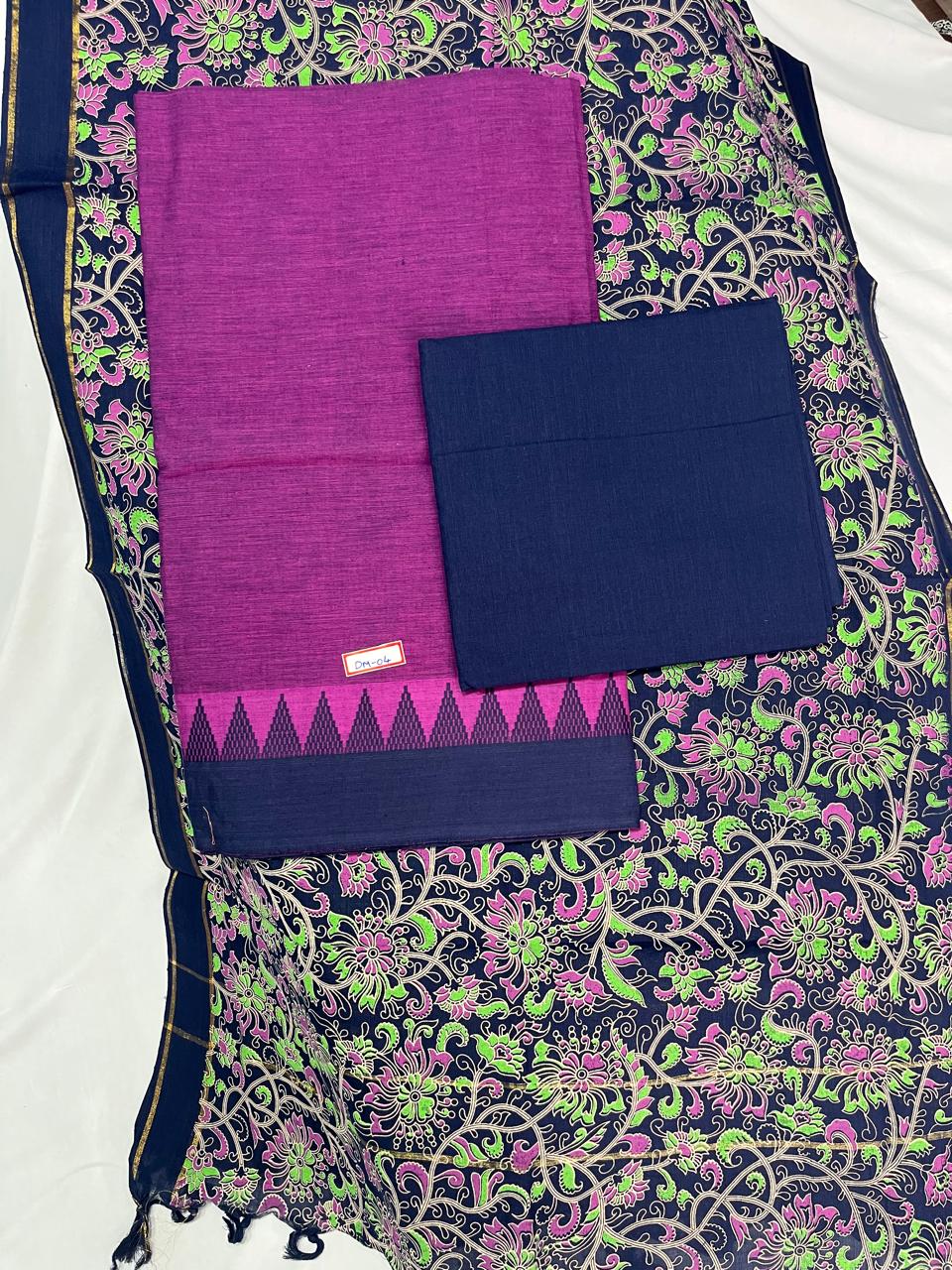 Handloom Cotton Dress Material – Purple & Dark Blue Color | Bhavana Handlooms