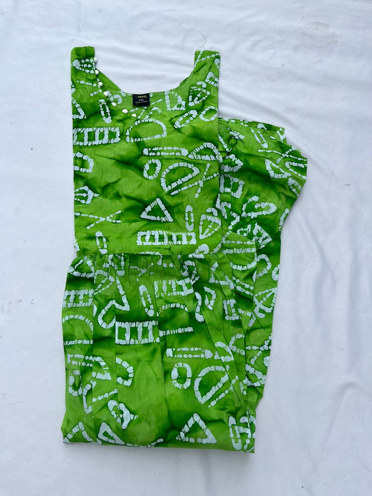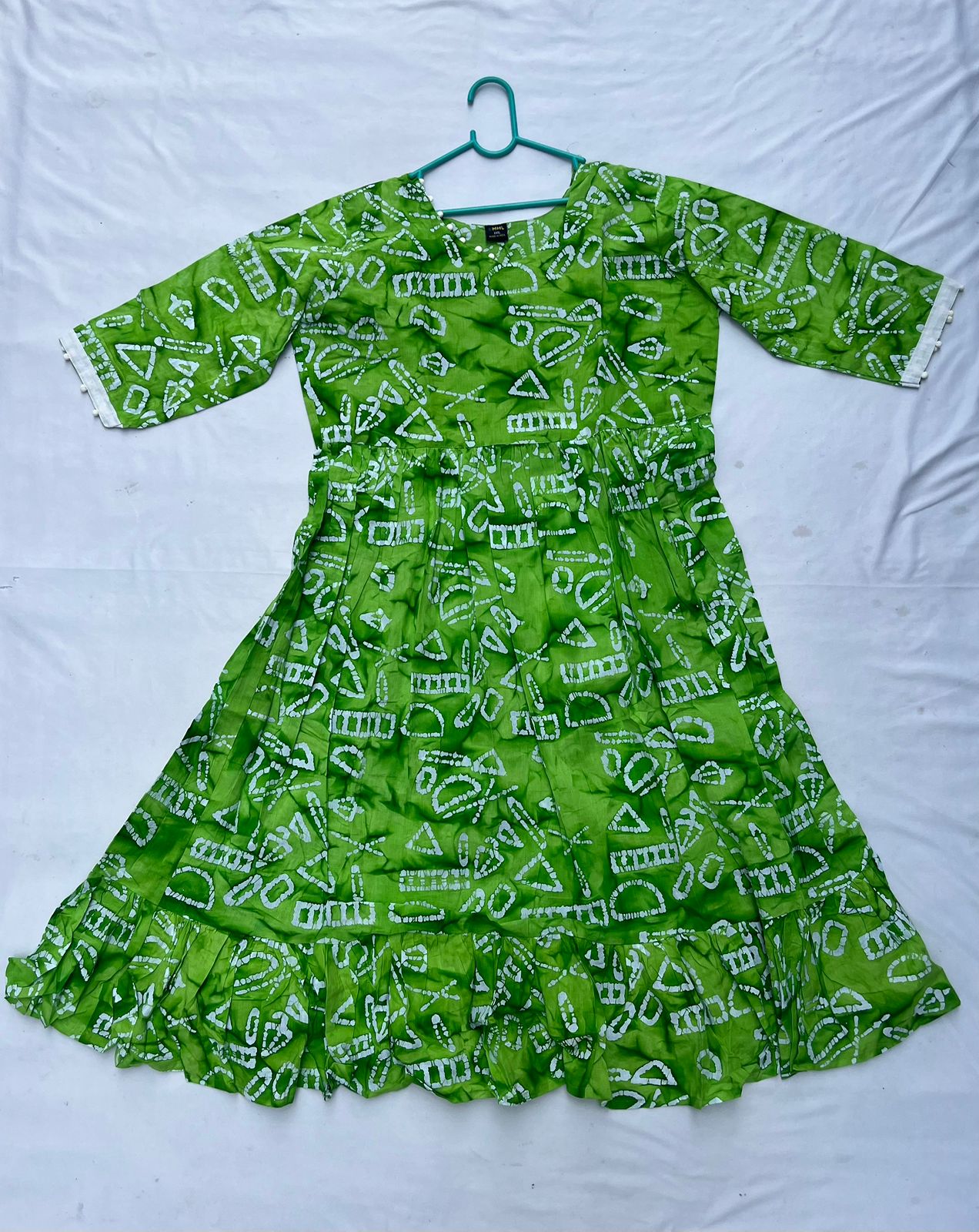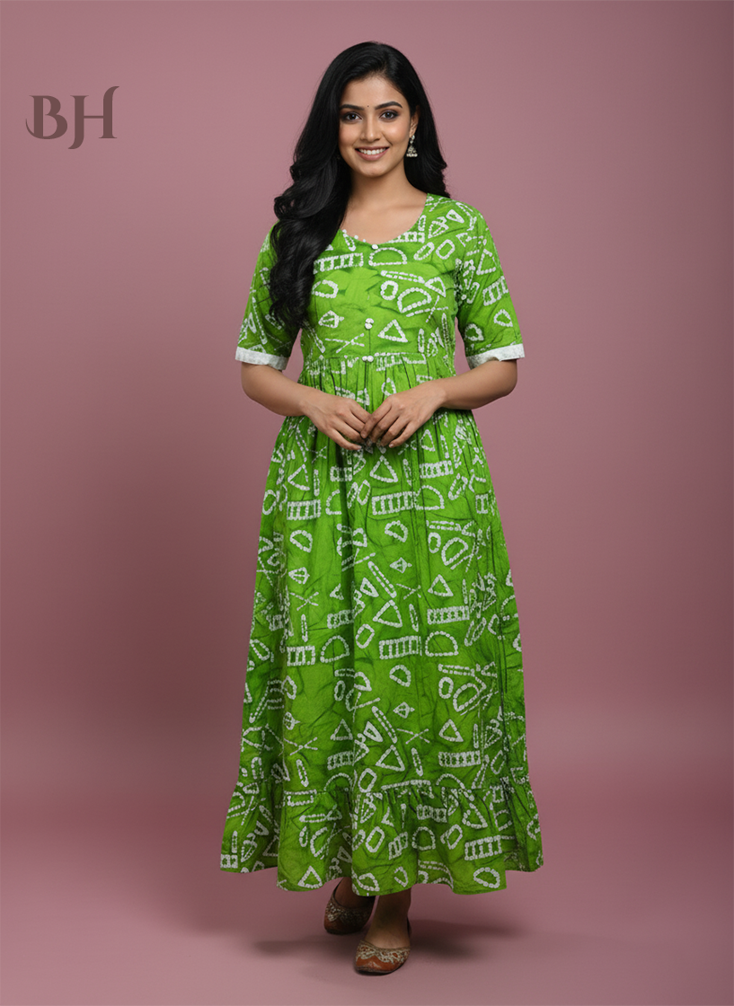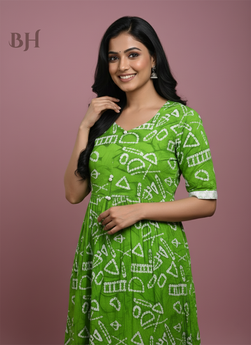 Handmade Batik Frock with Natural Dye – Potli Ball Neck Design Green Colour with Half Lining