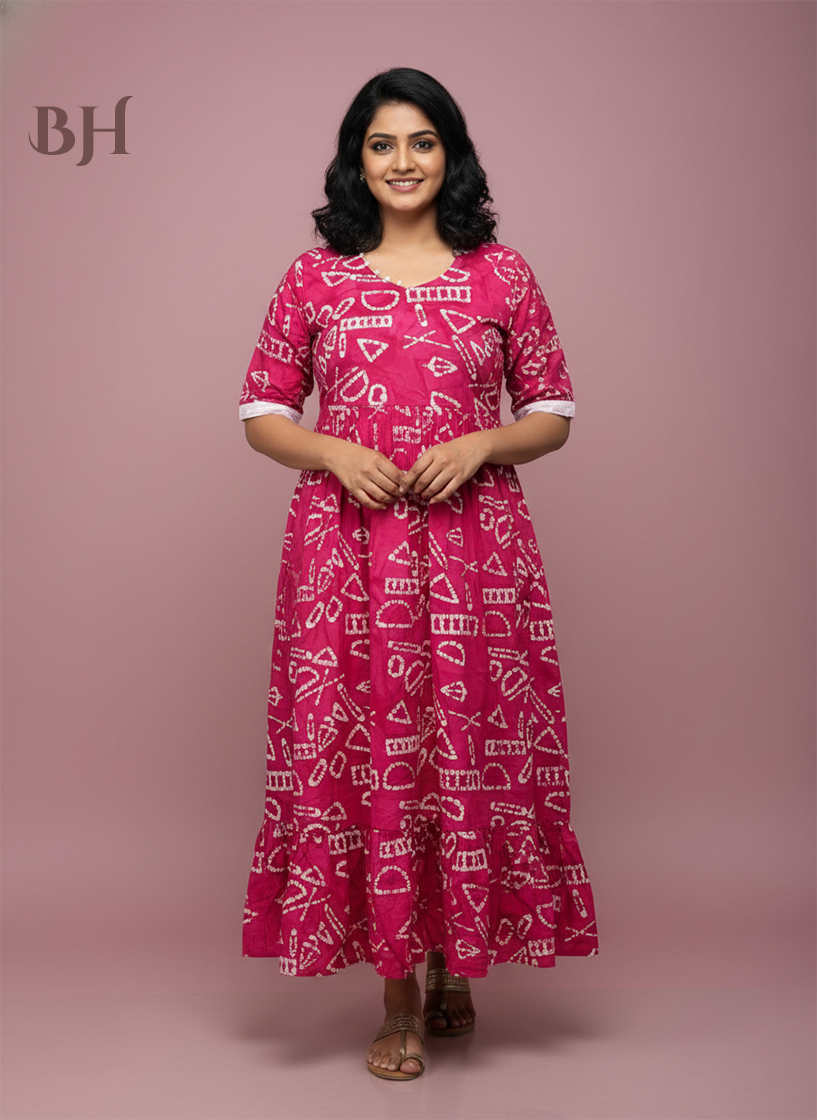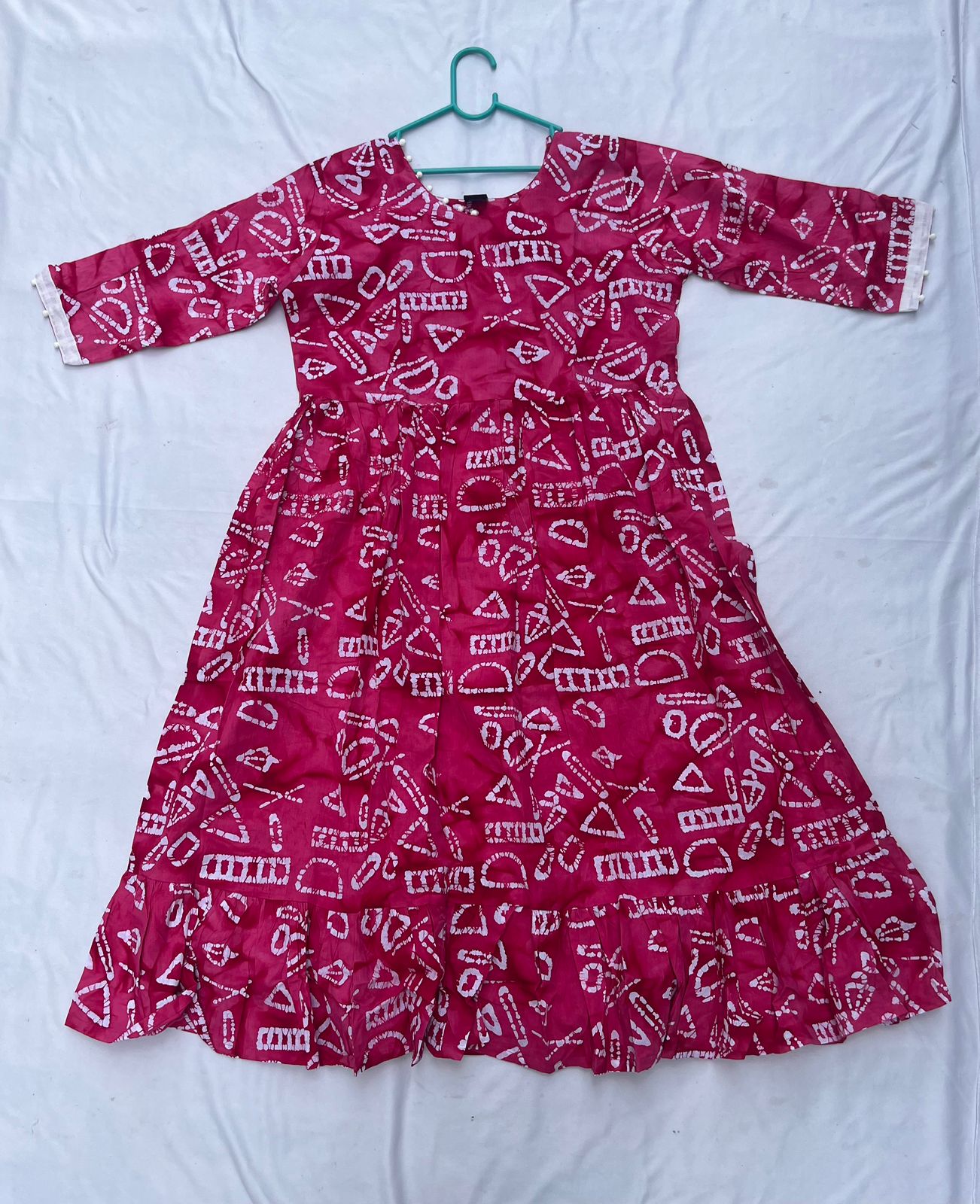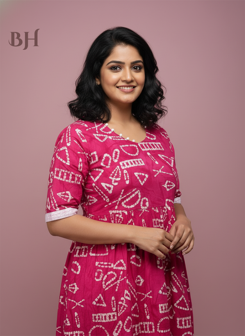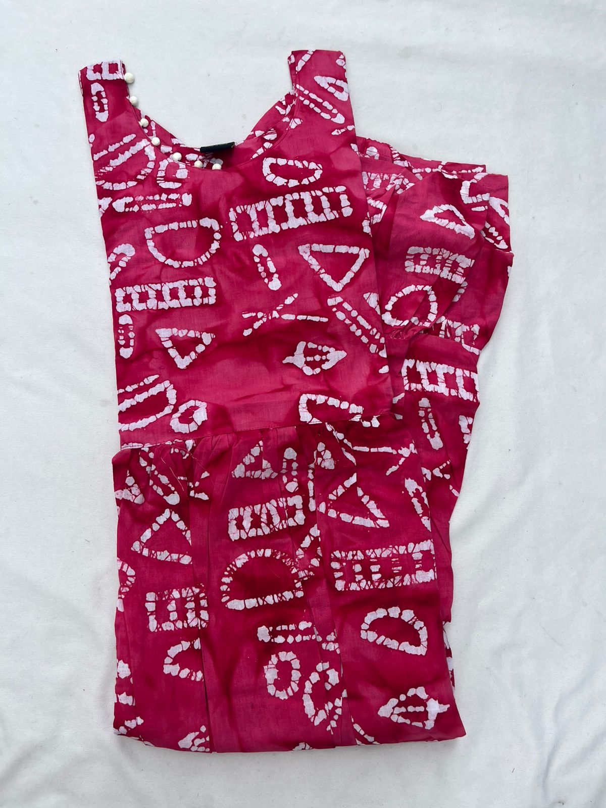 Handmade Batik Frock with Natural Dye – Potli Ball Neck Design Pink Colour with Half Lining