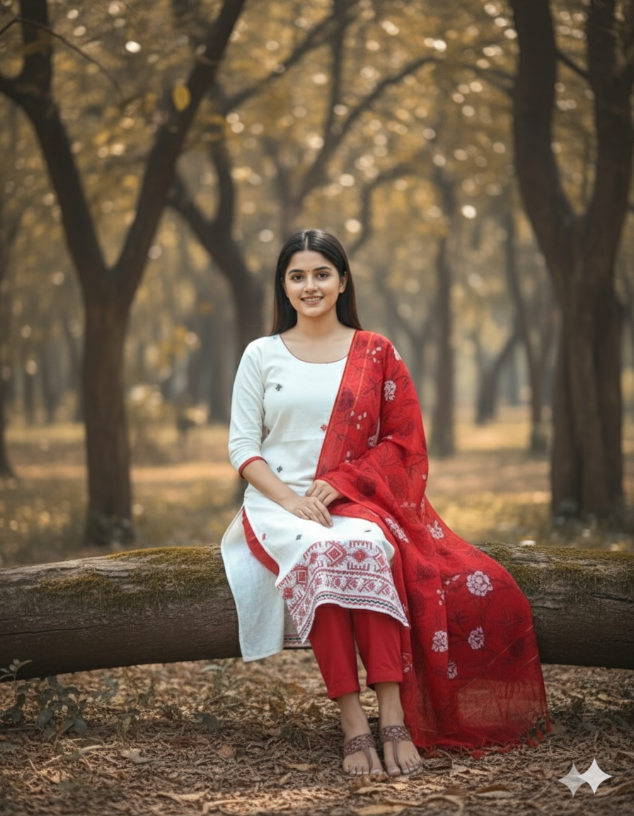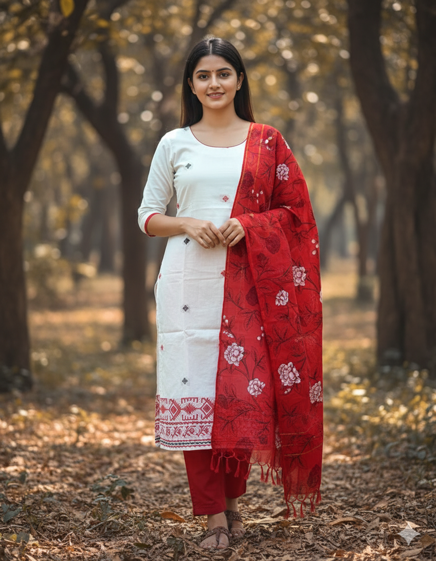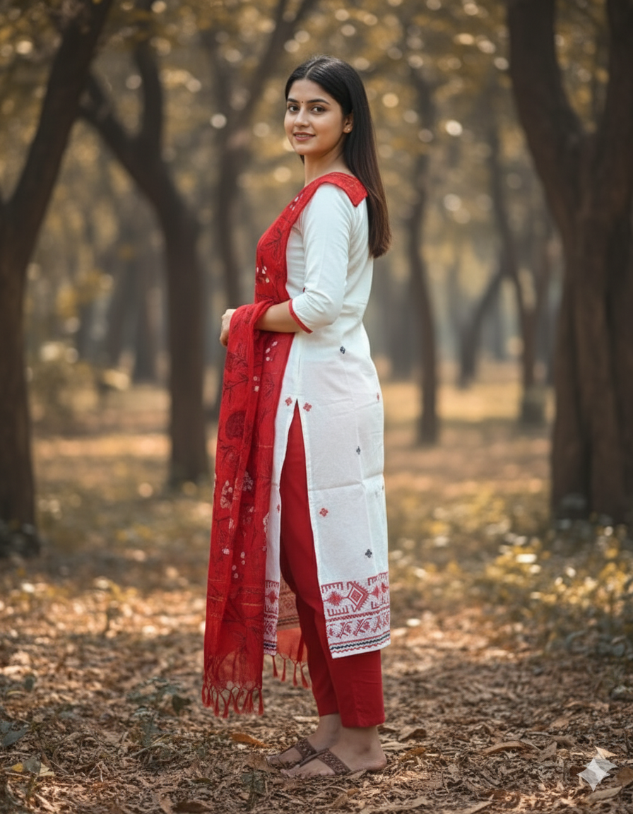 Jacquard Cotton Kurti Set Half White & Red – Straight Cut Style, Elbow Length Sleeves