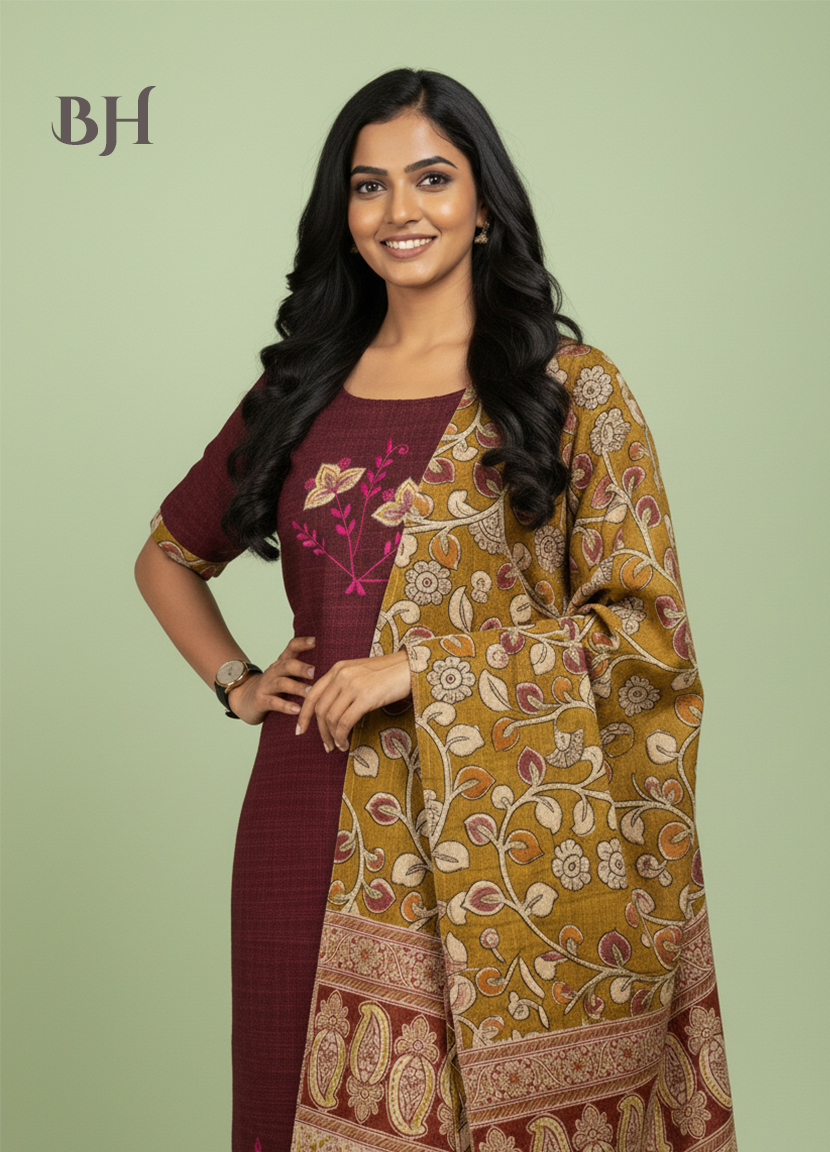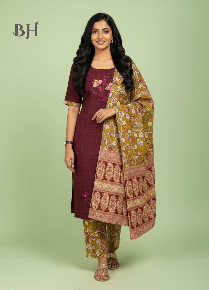 Kalamkari 3pc Set with Embroidery & Mirror Work Maroon & Black