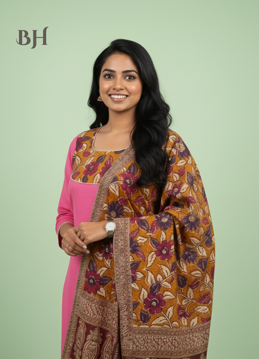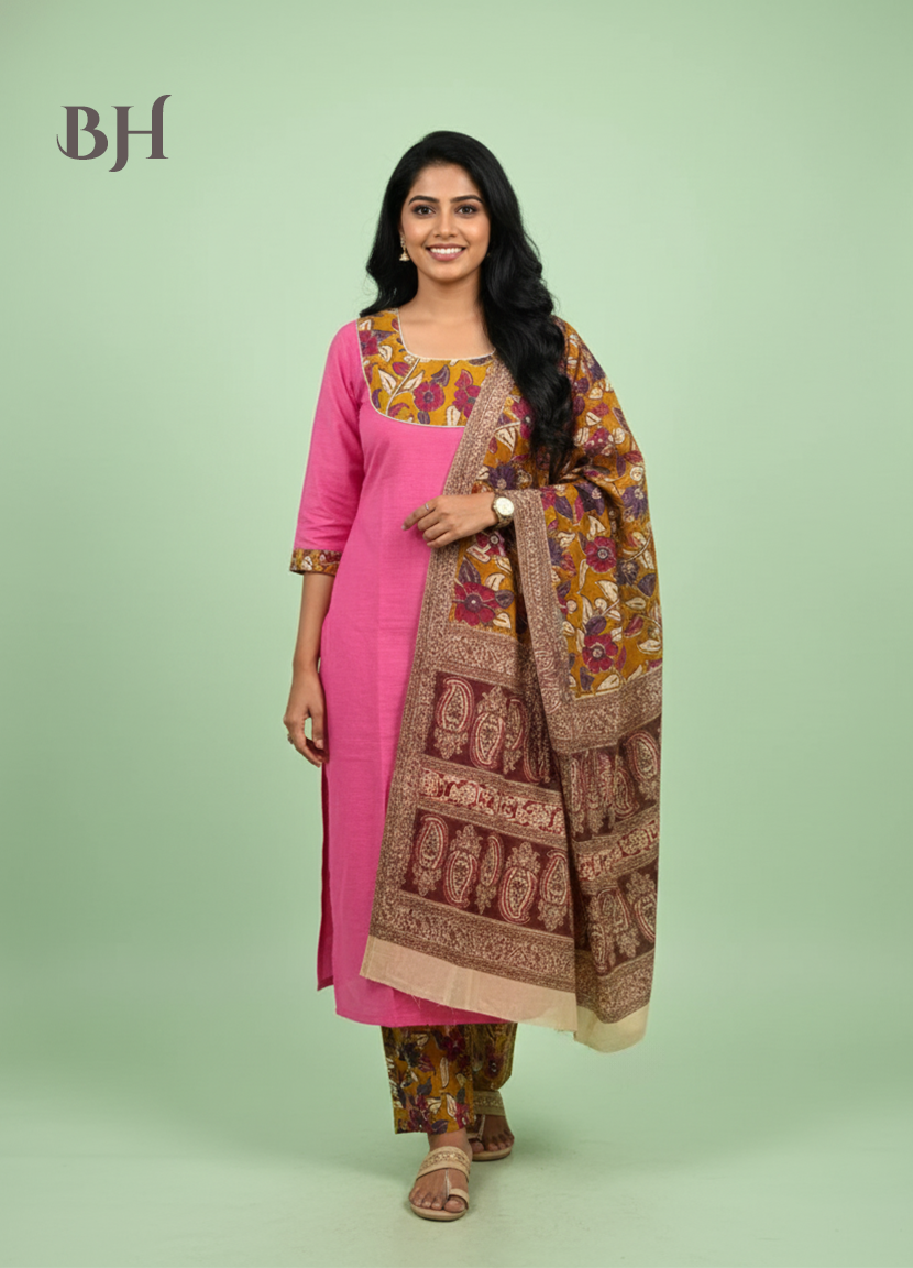 Kalamkari Cotton Readymade Straightcut Kurti Set with Rosy Pink Colour