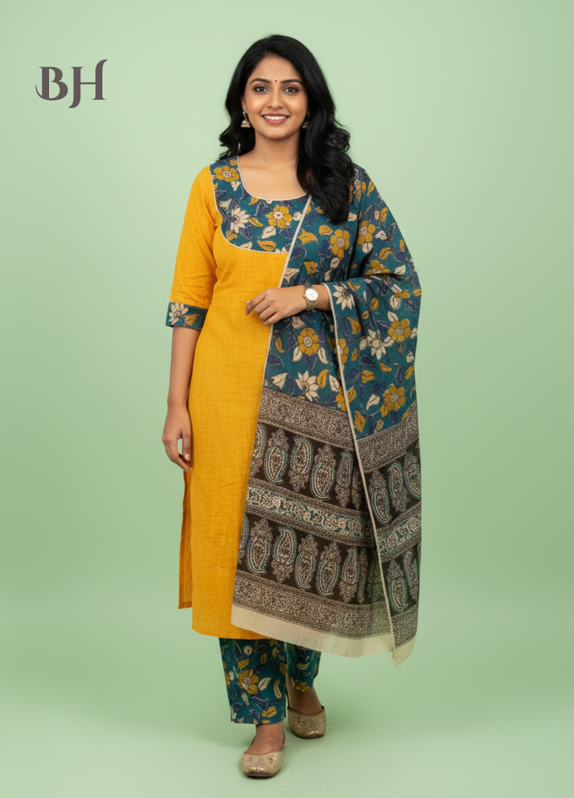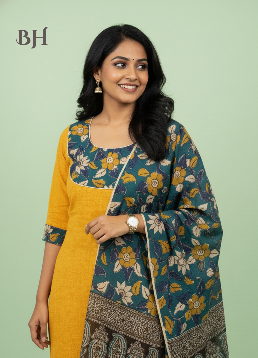 Kalamkari Cotton Readymade Straightcut Kurti Set with Yellow Colour