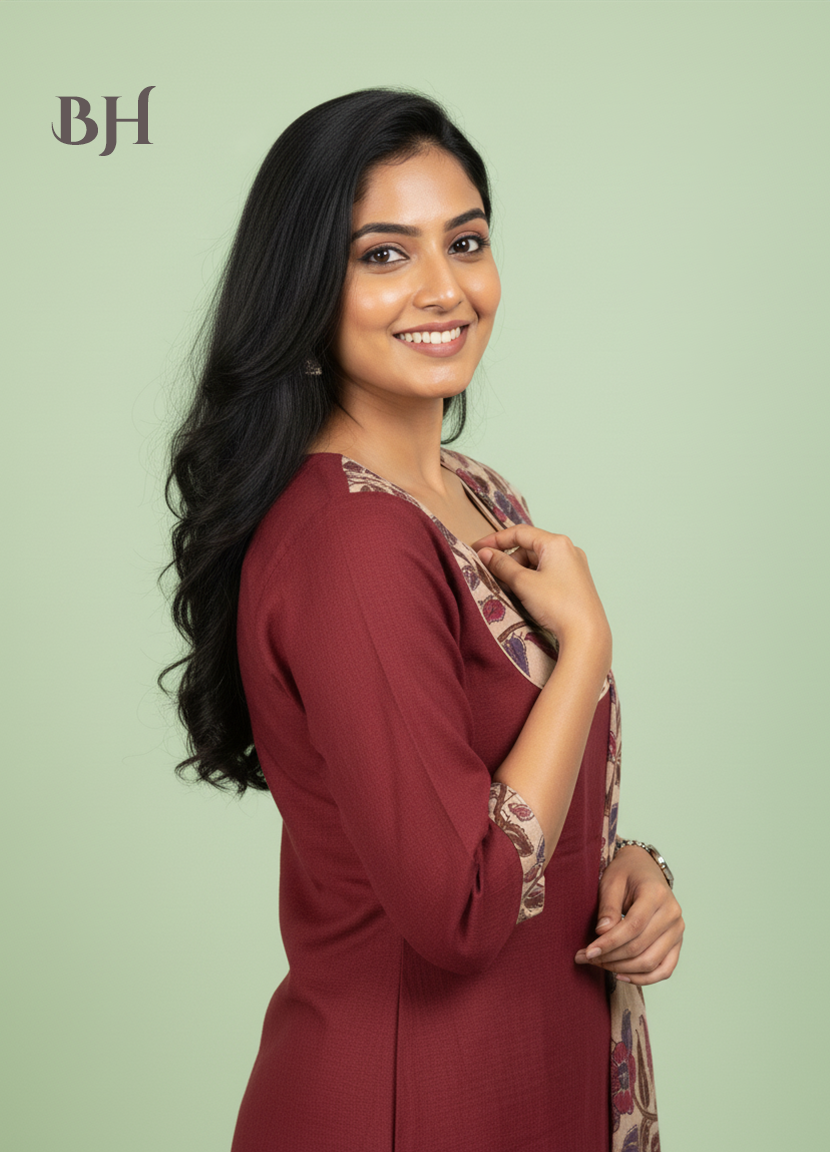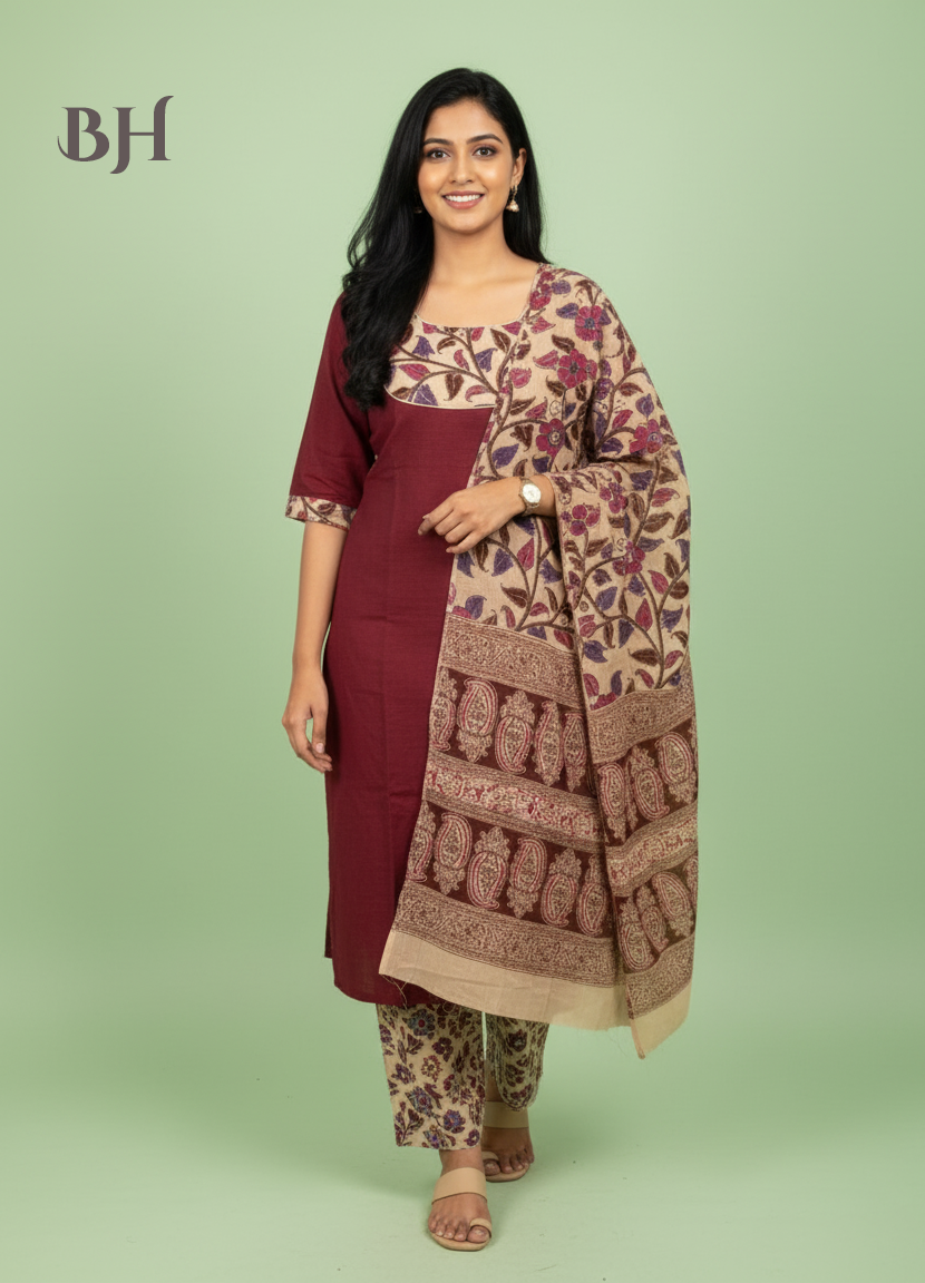 Kalamkari Cotton Readymade Straightcut Kurti Set with Cherry Wood Colour