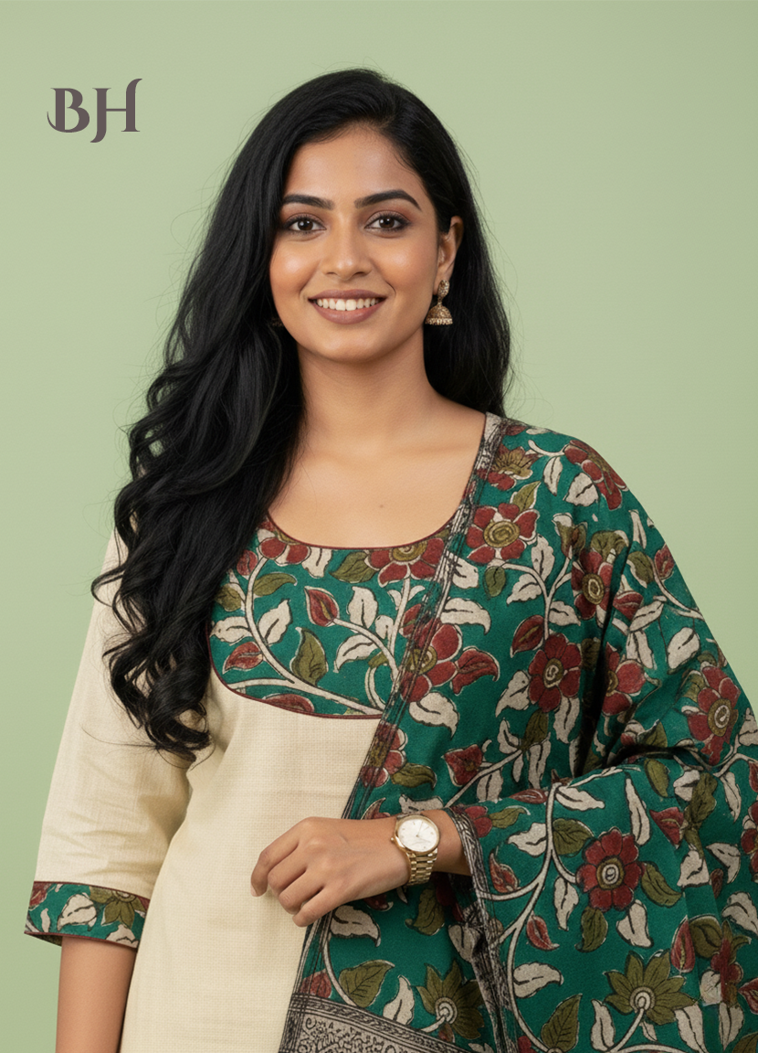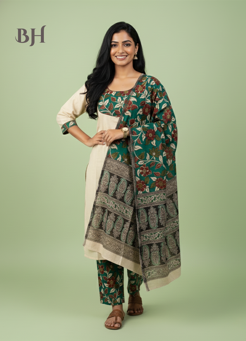 Kalamkari Cotton Readymade Straightcut Kurti Set with Cream Colour