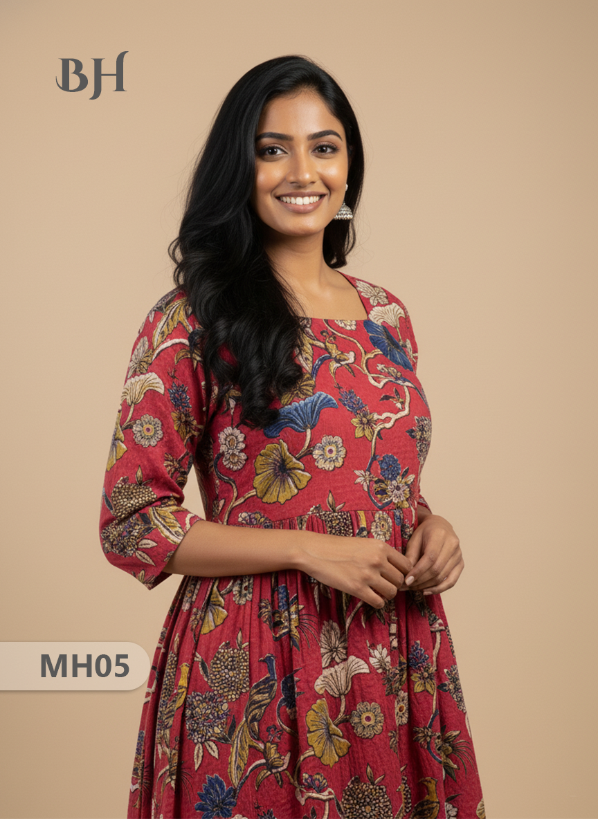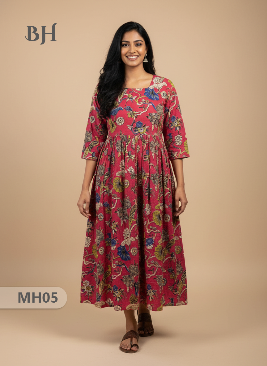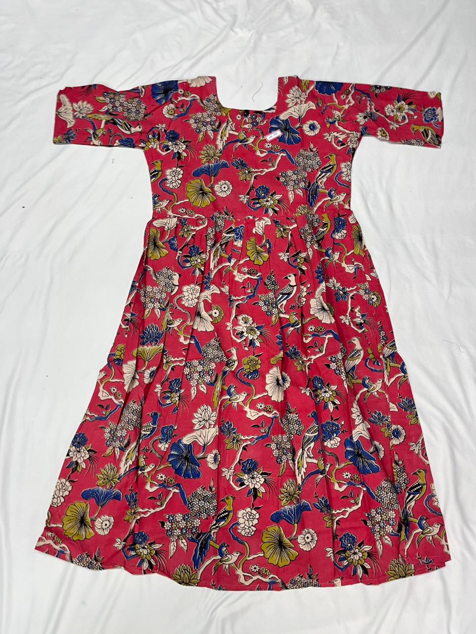 Keywords: Kalamkari Frock, Handloom Cotton Frock, Red Kalamkari Dress, Bhavana Originals Frock, Half-Length Lined Cotton Frock, Traditional Ethnic Wear.