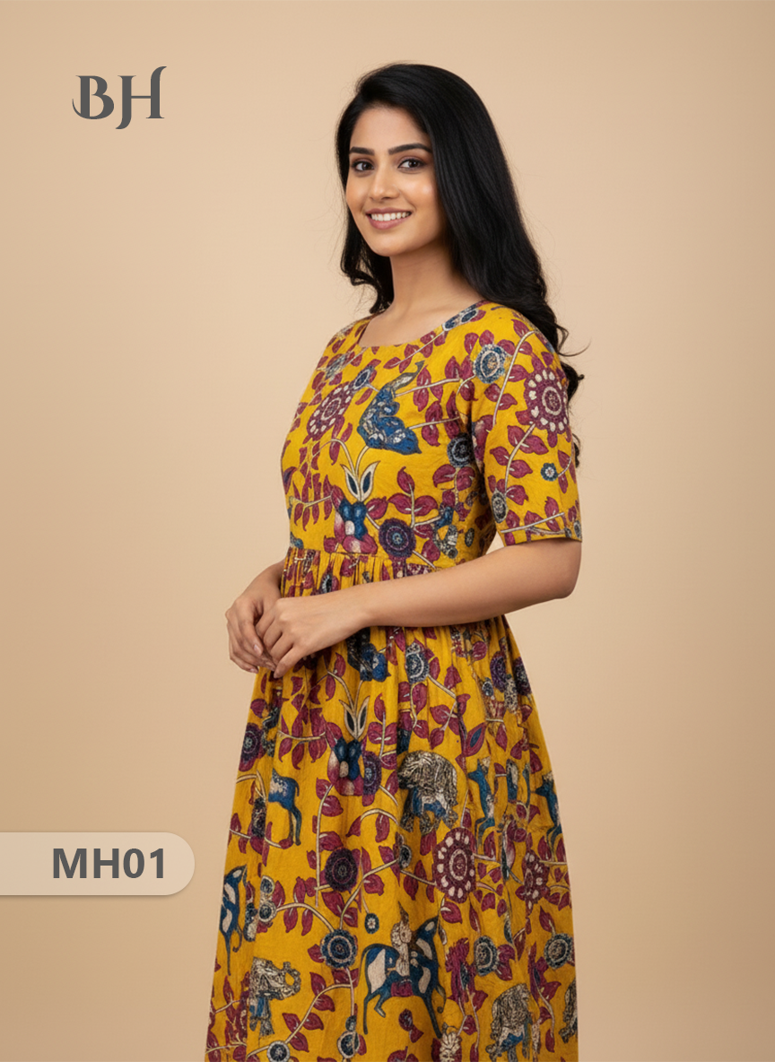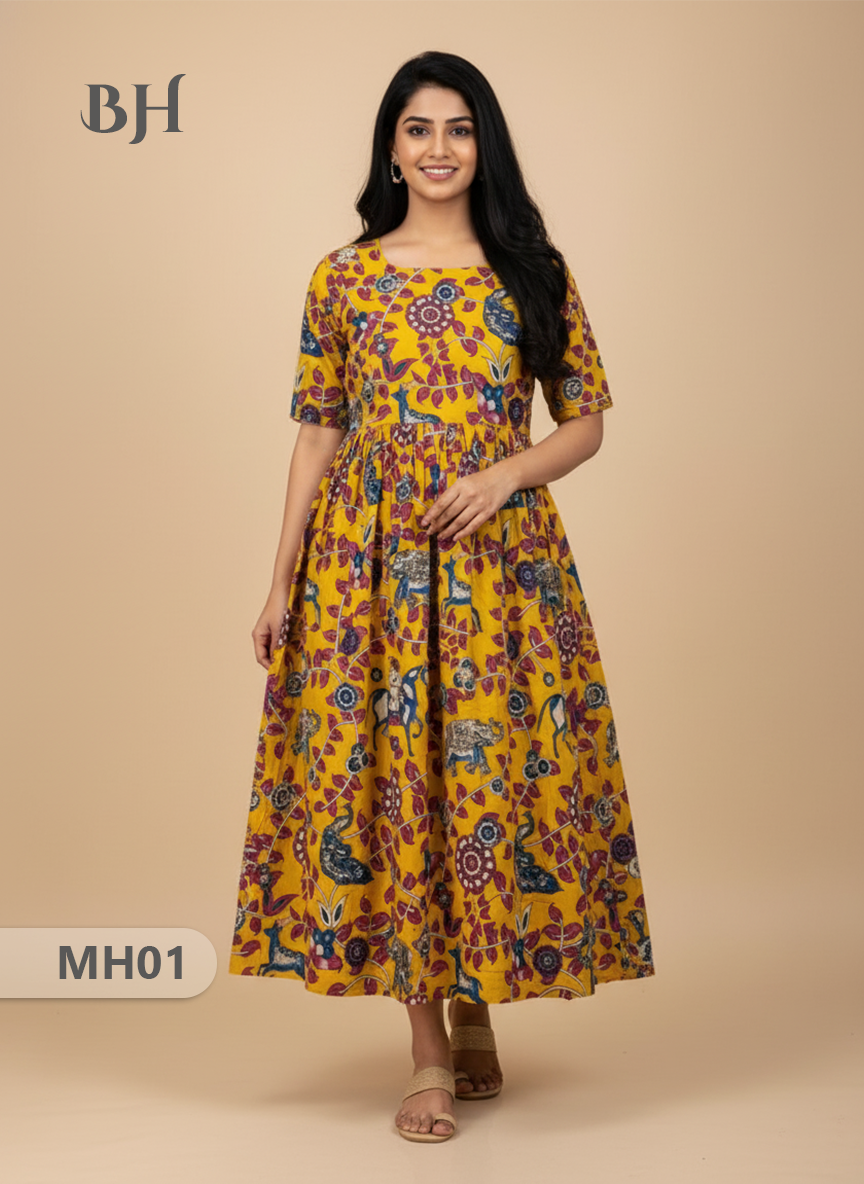 Kalamkari Design Frock – Yellow Colour | Handloom Ethnic Wear with Half Lining