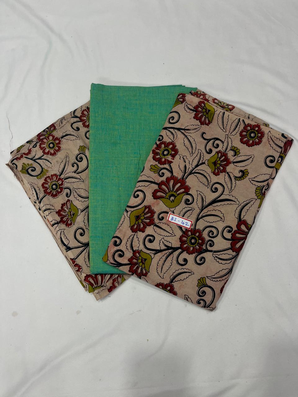 This set includes 1 plain cotton top, 1 Kalamkari printed bottom, and 1 Kalamkari printed dupatta.