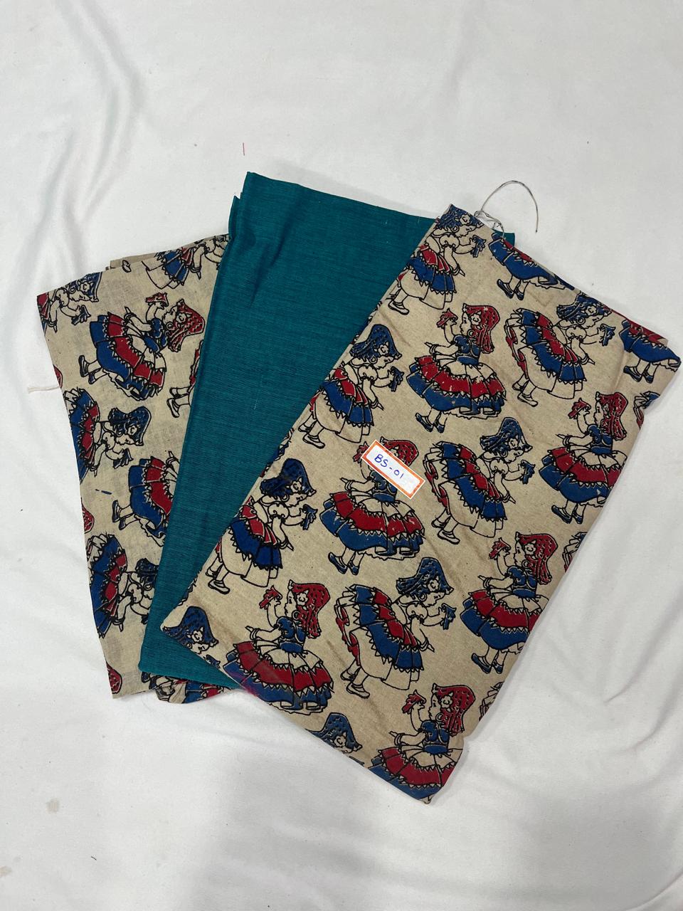 • Includes a plain cotton top material paired with Kalamkari print bottom and matching Kalamkari dupatta.