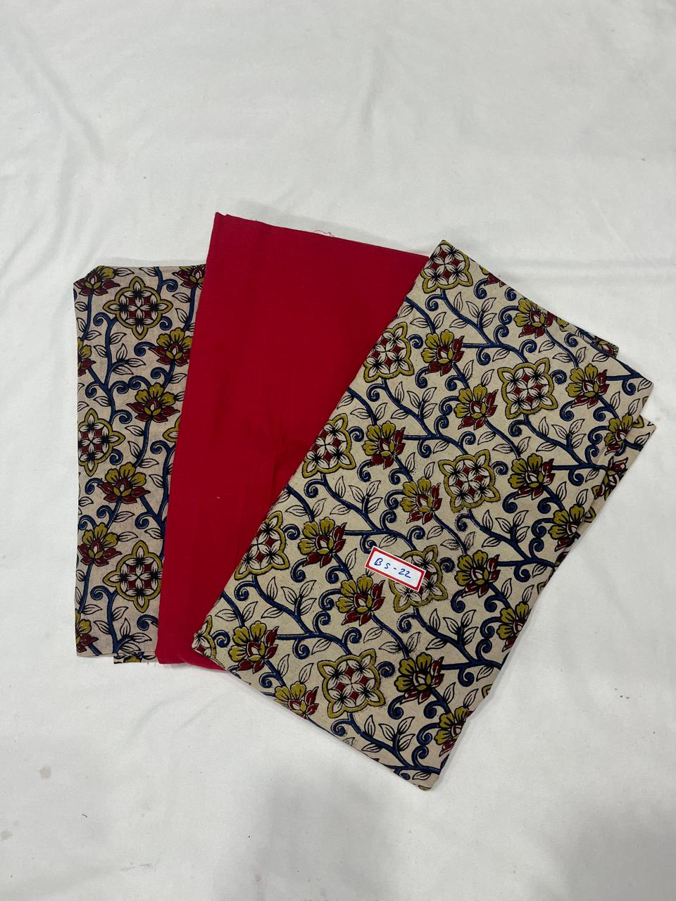 • Includes a plain cotton top material paired with Kalamkari print bottom and matching Kalamkari dupatta.