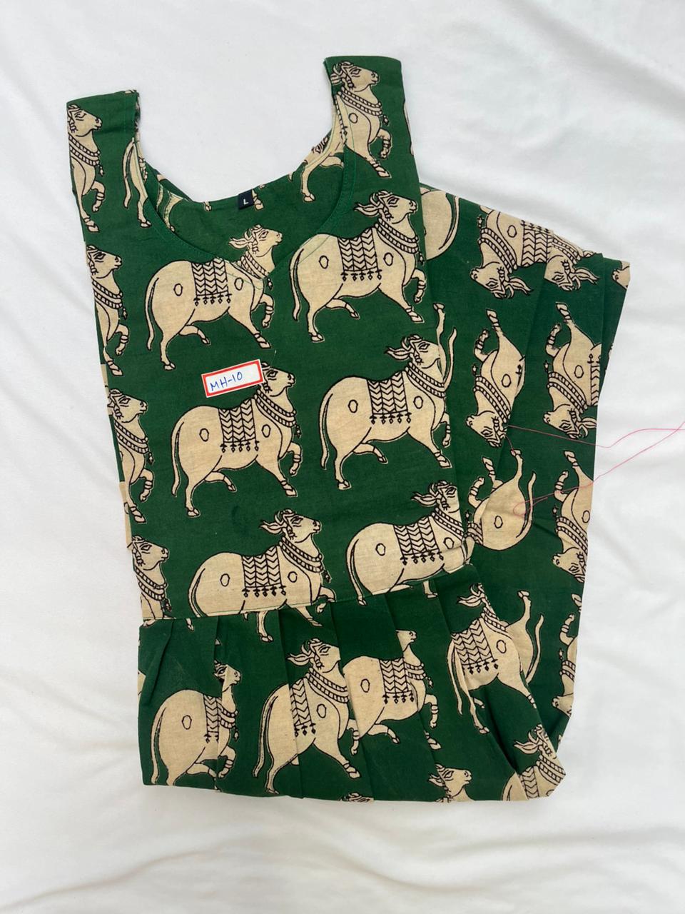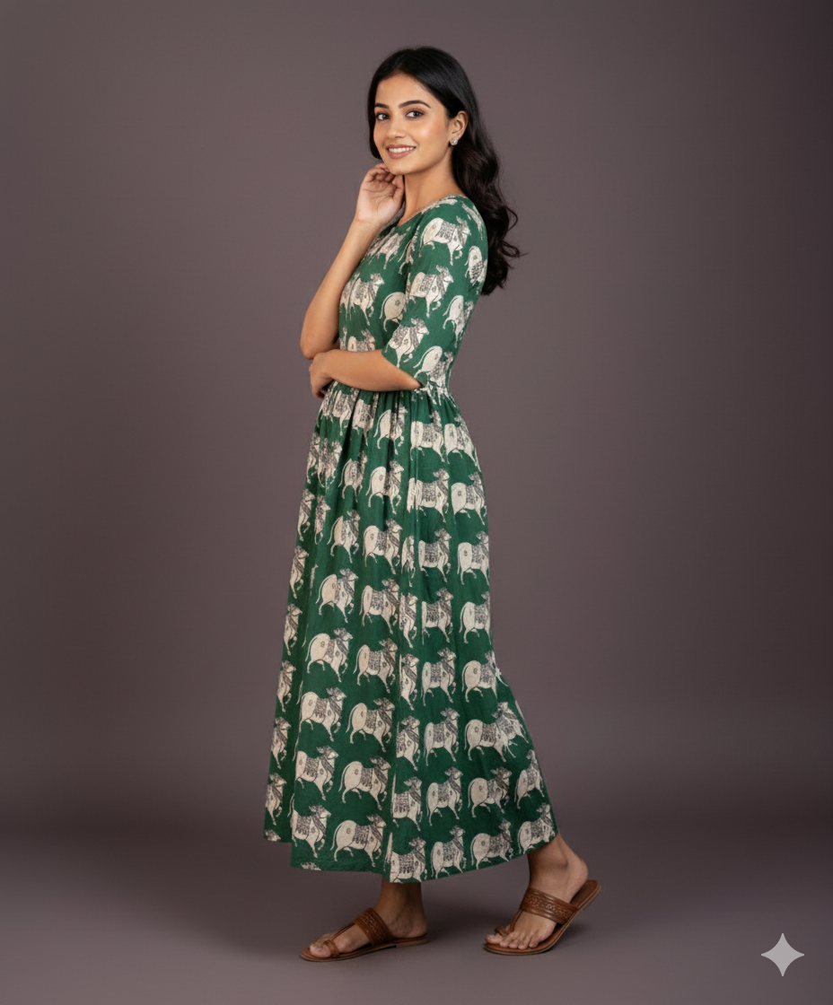 Kalamkari Pichwai Cow Design Frock – Green Colour | Handloom Ethnic Wear with Half Lining