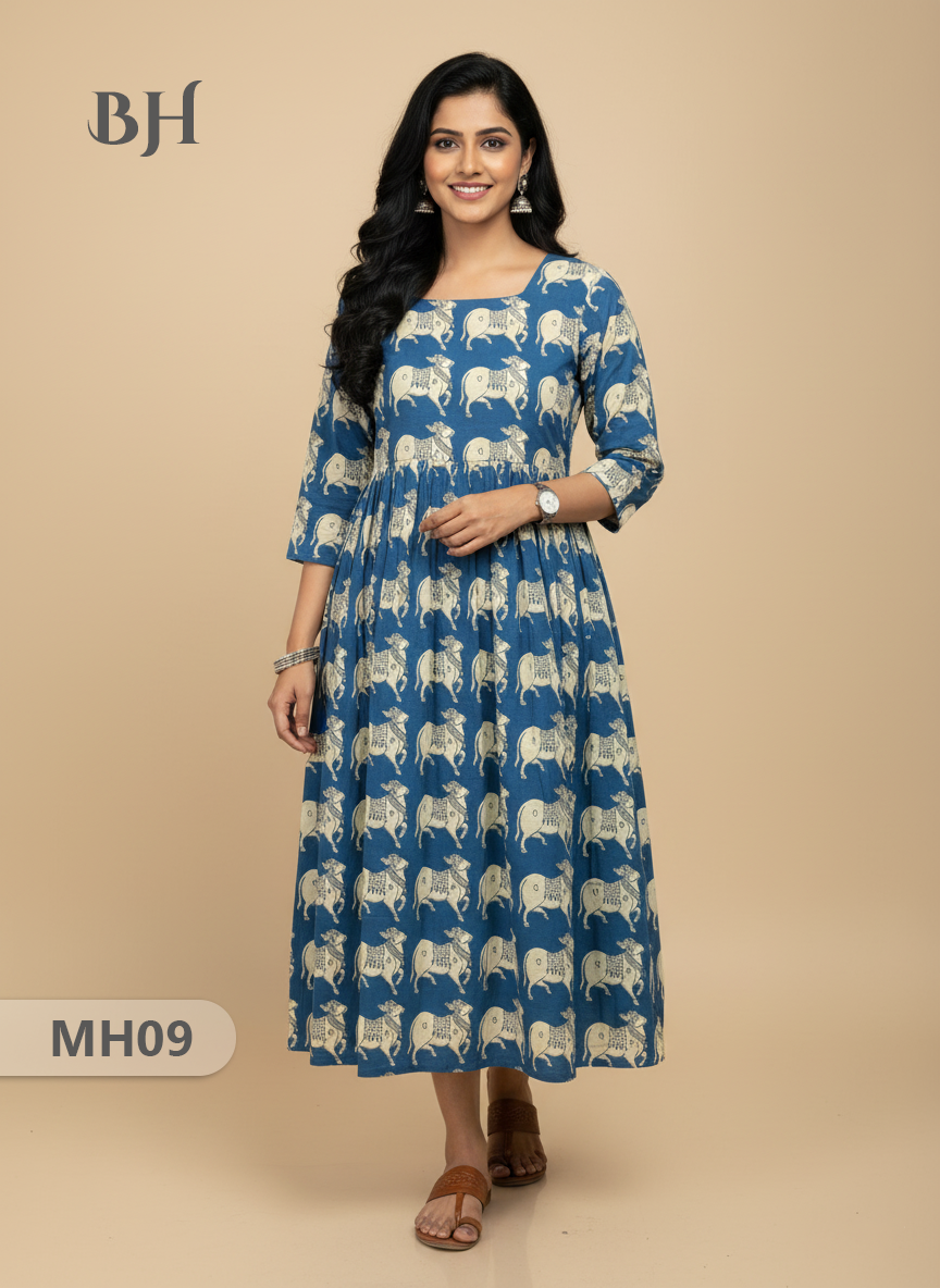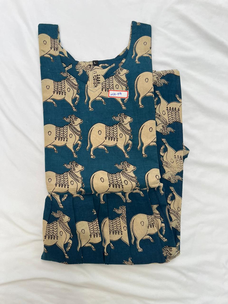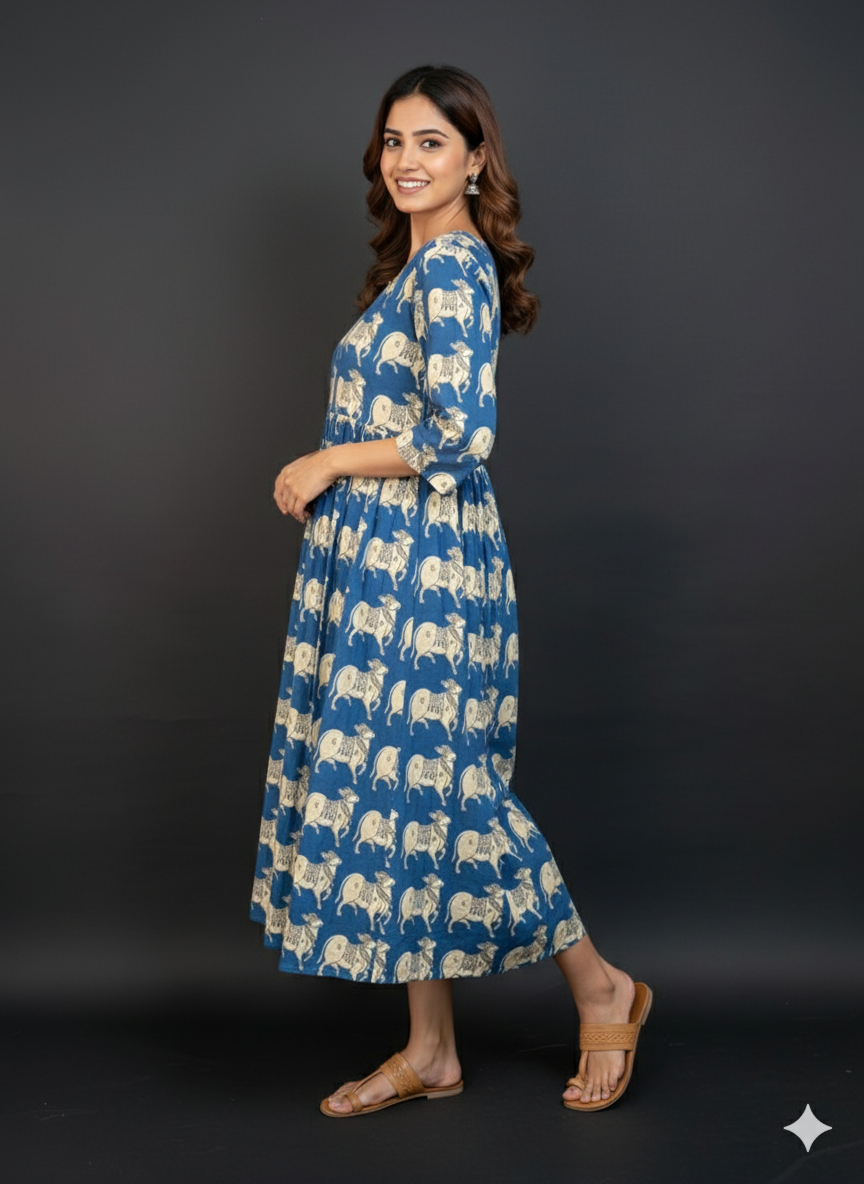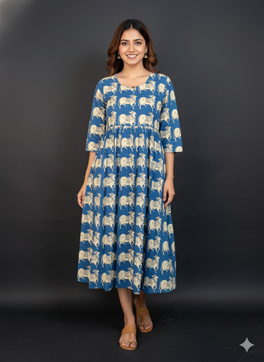 Kalamkari Pichwai Cow Design Frock – Blue Colour | Handloom Ethnic Wear with Half Lining