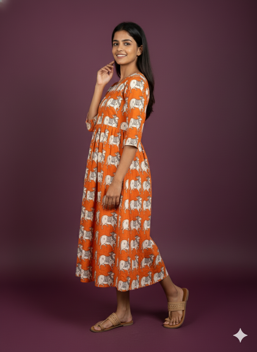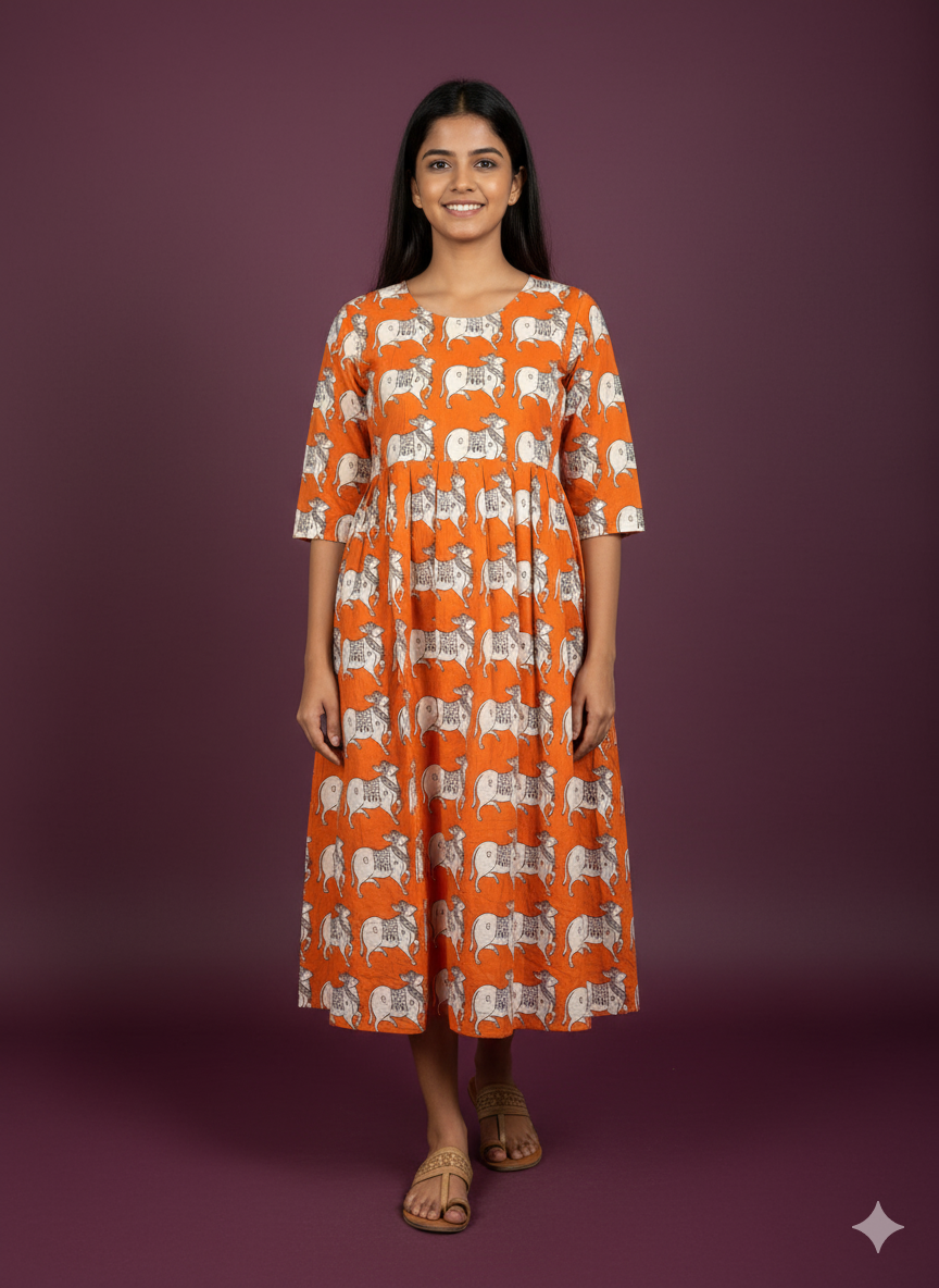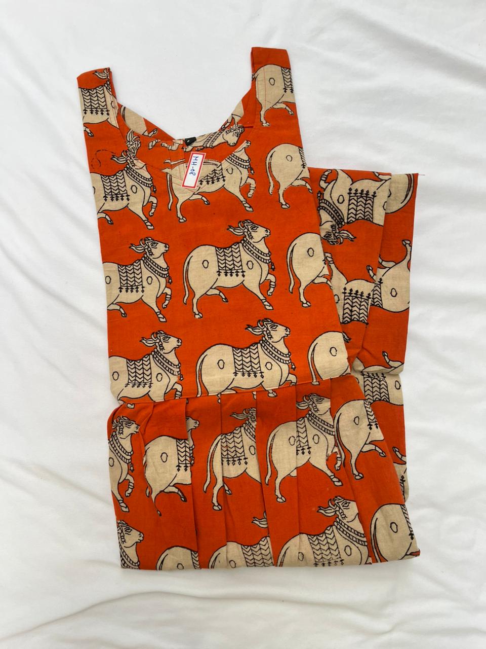 Kalamkari Pichwai Cow Design Frock – Orange Colour | Handloom Ethnic Wear with Half Lining