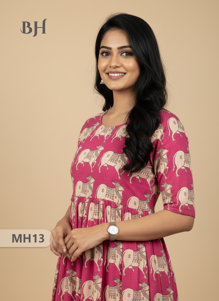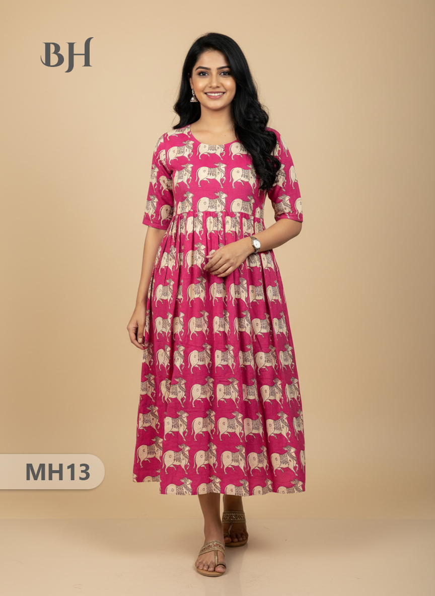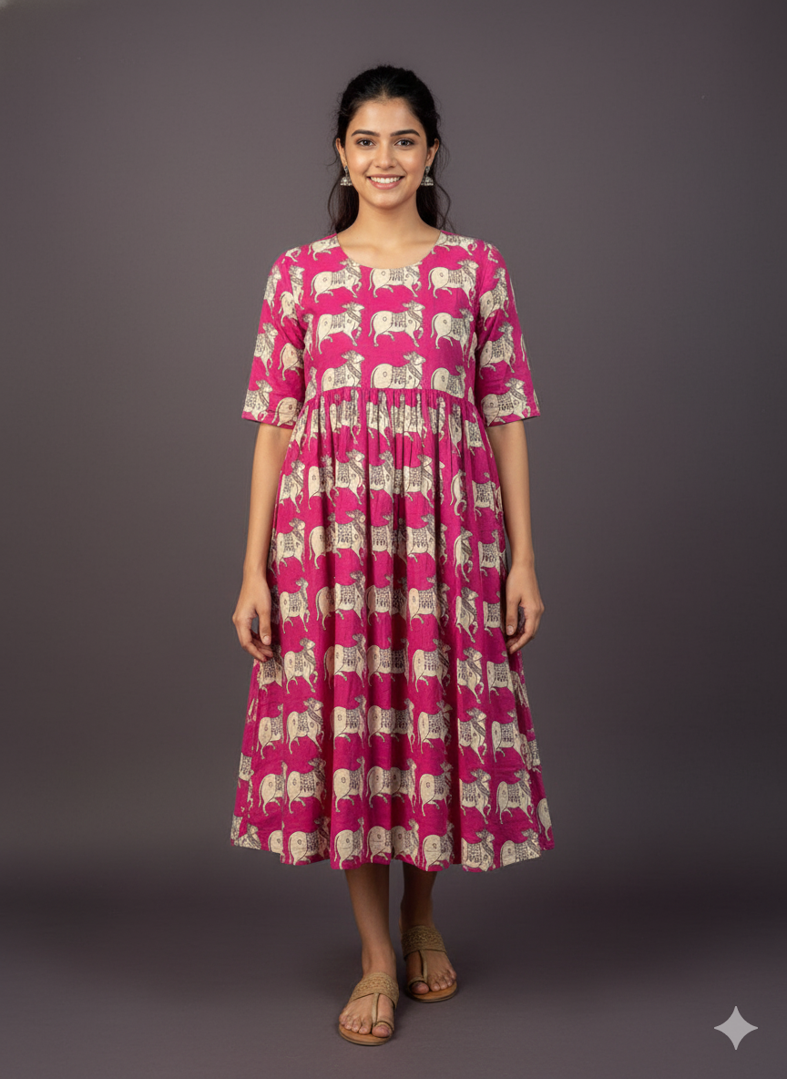 Kalamkari Pichwai Cow Design Frock – Pink Colour | Handloom Ethnic Wear with Half Lining