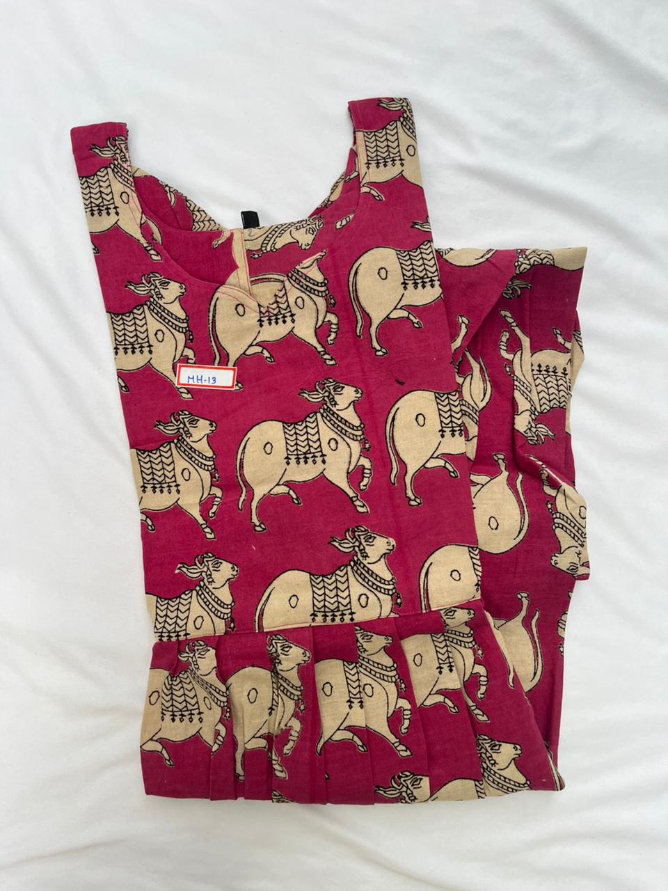 Keywords: Kalamkari Frock, Handloom Cotton Frock, Red Kalamkari Dress, Bhavana Originals Frock, Half-Length Lined Cotton Frock, Traditional Ethnic Wear.