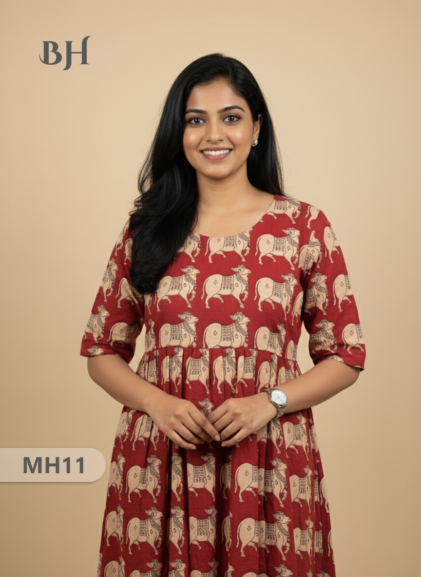 Keywords: Kalamkari Frock, Handloom Cotton Frock, Red Kalamkari Dress, Bhavana Originals Frock, Half-Length Lined Cotton Frock, Traditional Ethnic Wear.