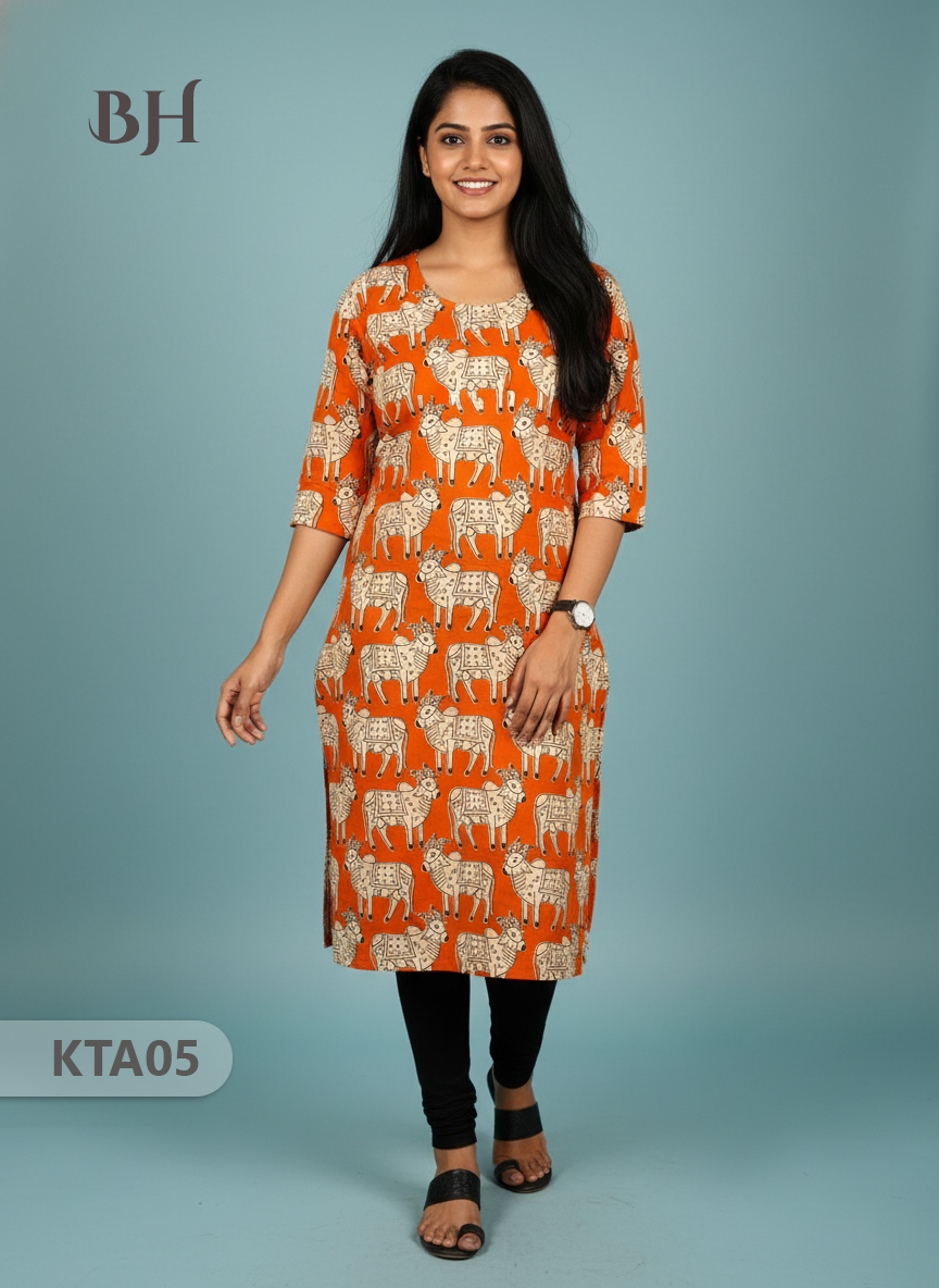 Kalamkari Straight Cut Top Orange Color with Full Length Lining | Ethnic Cotton Wear