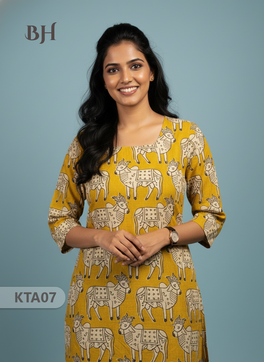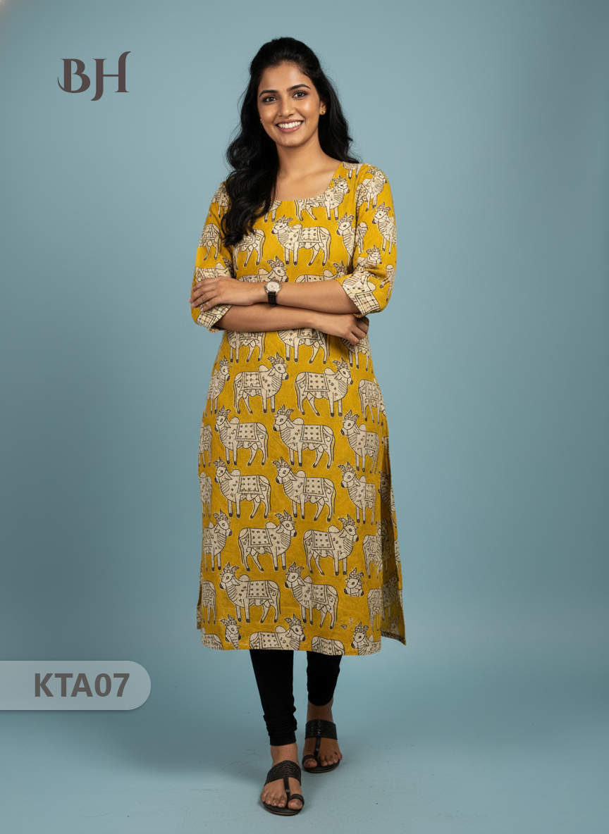 Kalamkari Straight Cut Top Yellow Color with Full Length Lining | Ethnic Cotton Wear