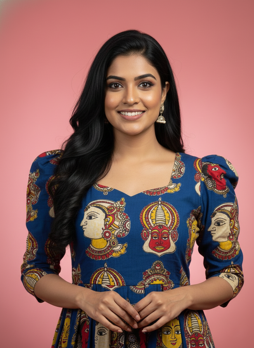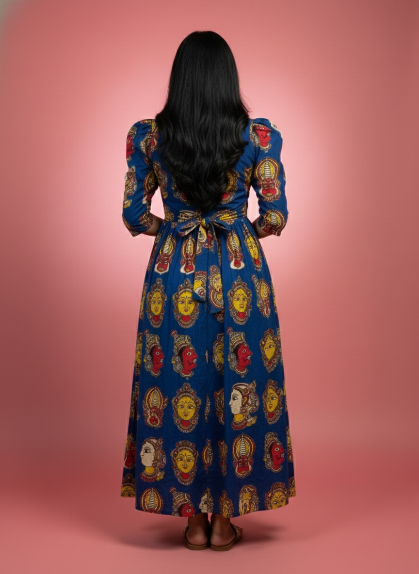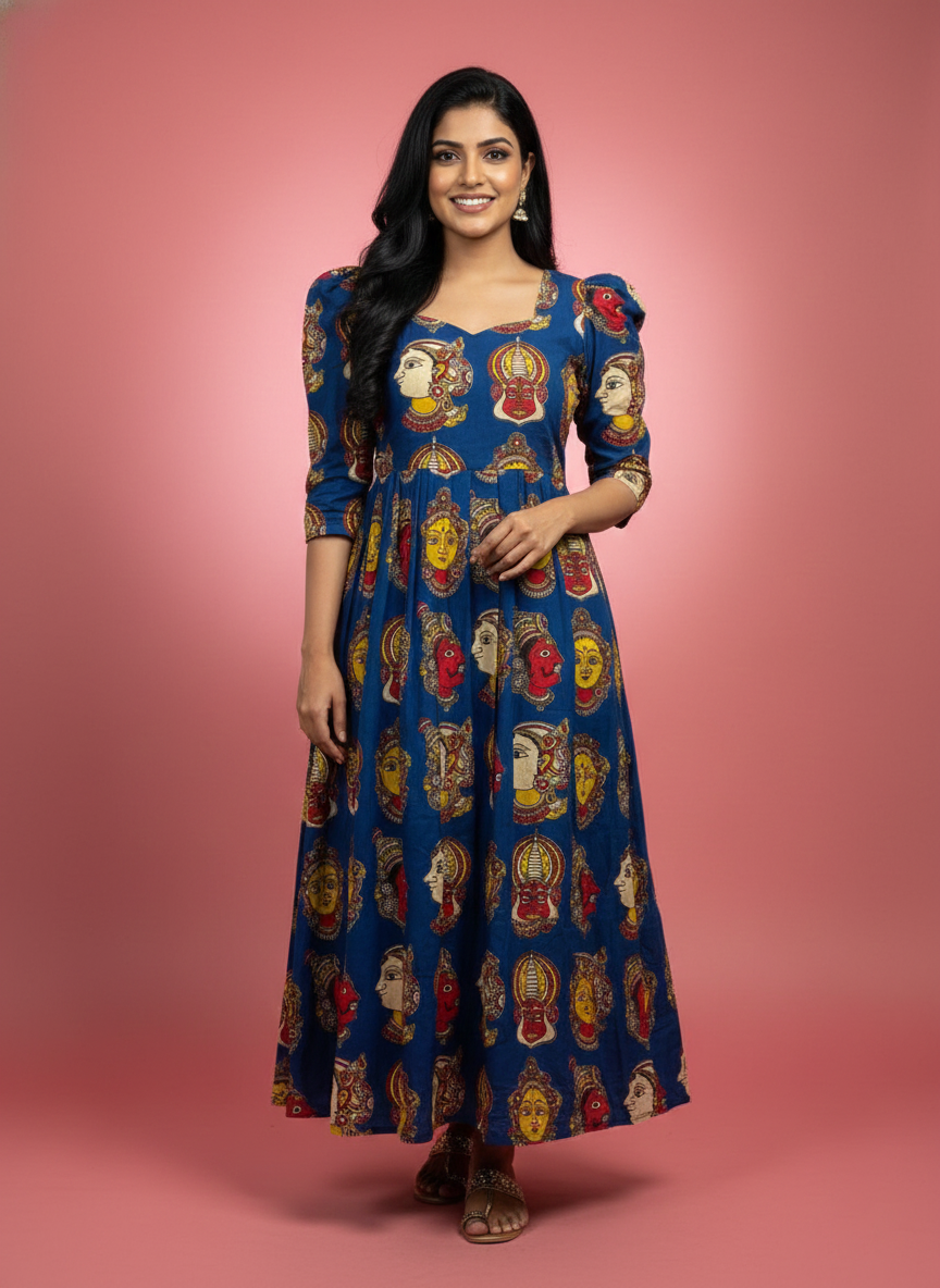 Kathakali Design Kalamkari Frock – Blue Colour with Half Lining