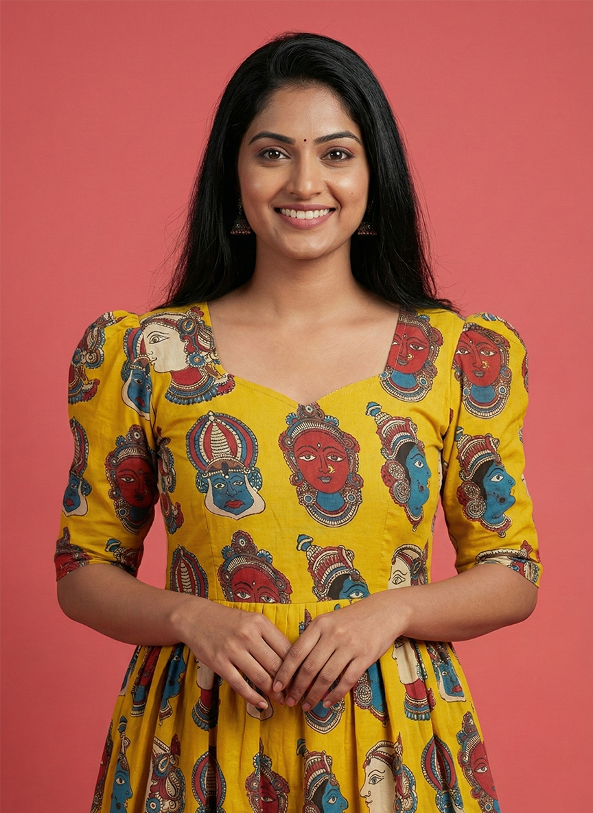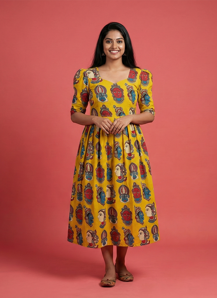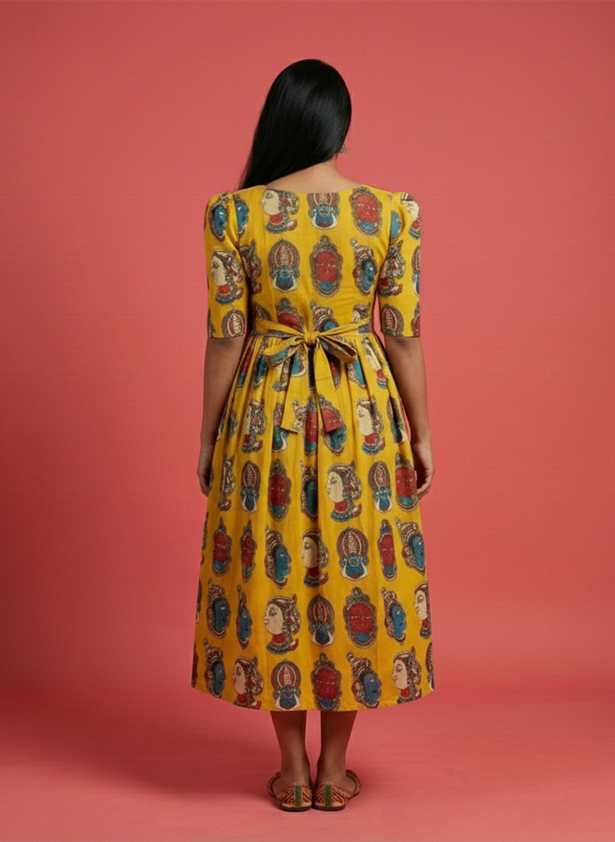 Kathakali Design Kalamkari Frock – Yellow Colour with Half Lining