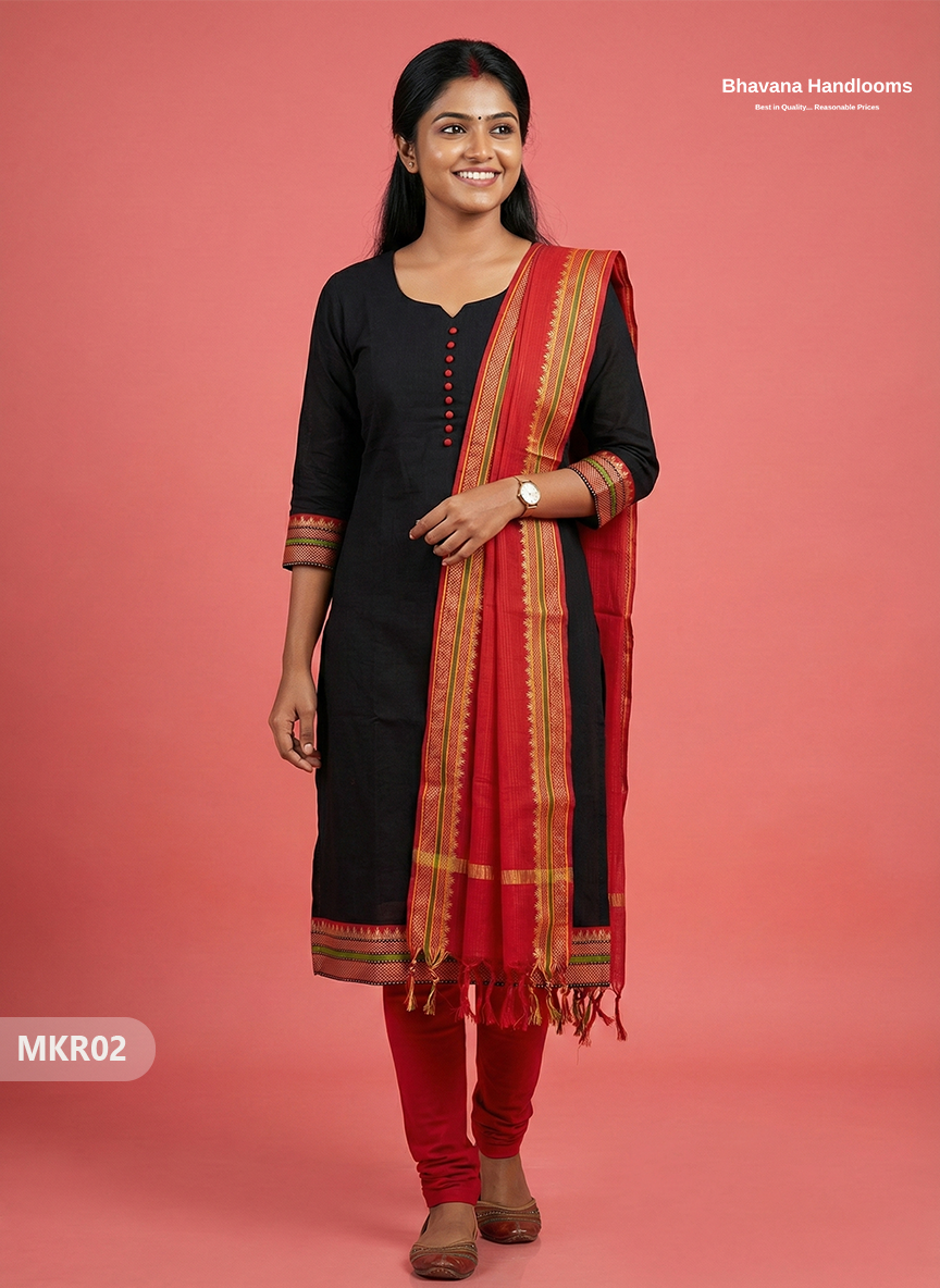 Mangalagiri Border Kurti Set with Potli Buttons | Black Colour | Traditional Cotton Ethnic Set