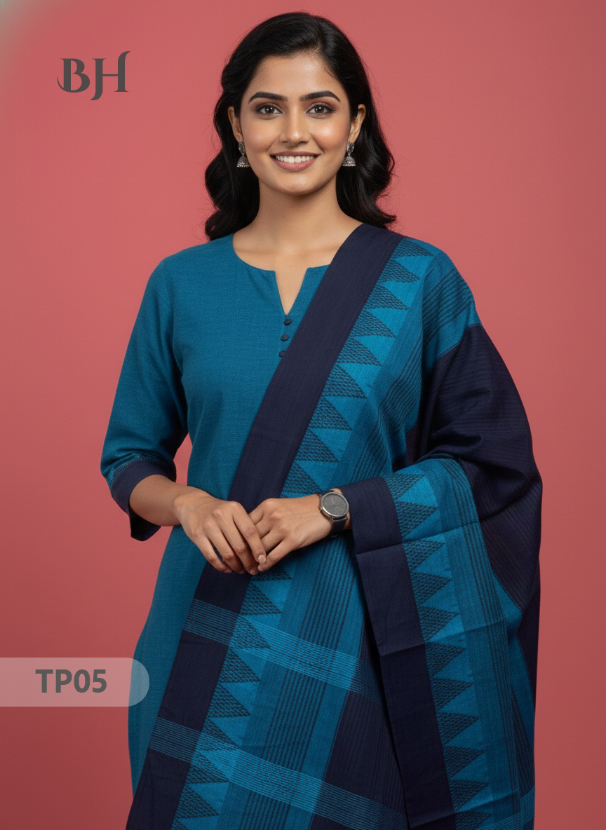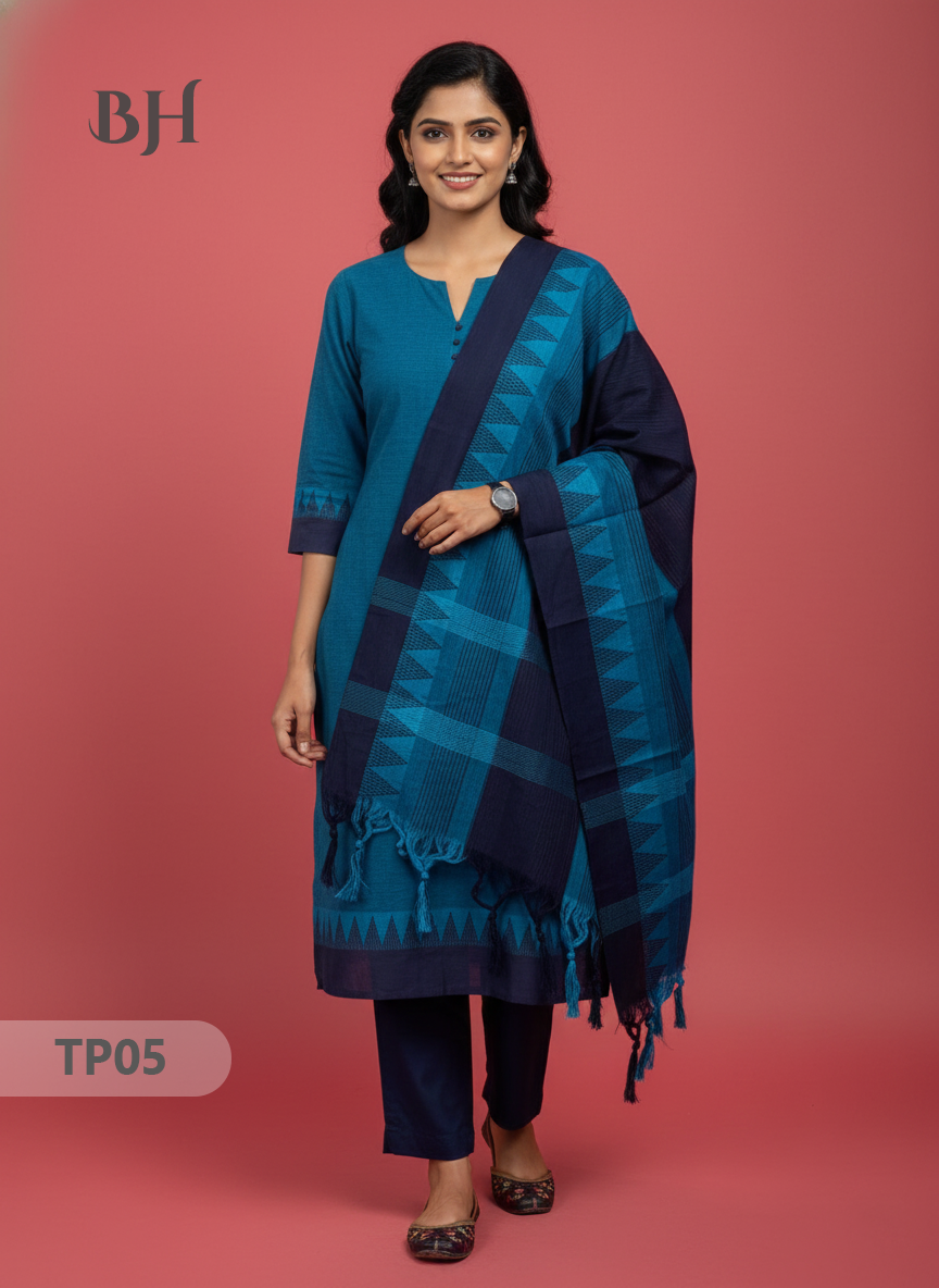Mangalagiri Cotton 3PC Set with Full-Length Lining & Elastic Pocket Bottom – Blue & Navy Blue Double Weave