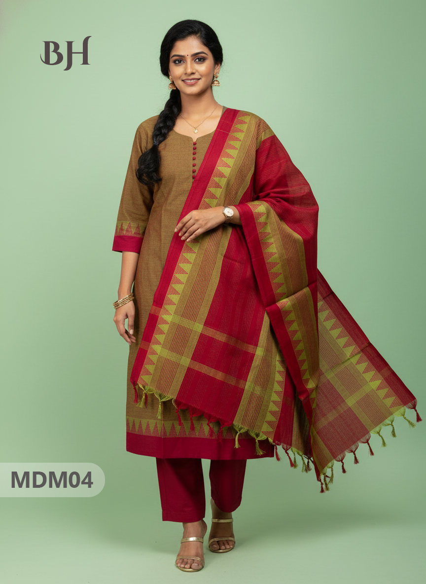 Mangalagiri Cotton 3PC Set with Full-Length Lining & Elastic Pocket Bottom – Brown & Red Double Weave